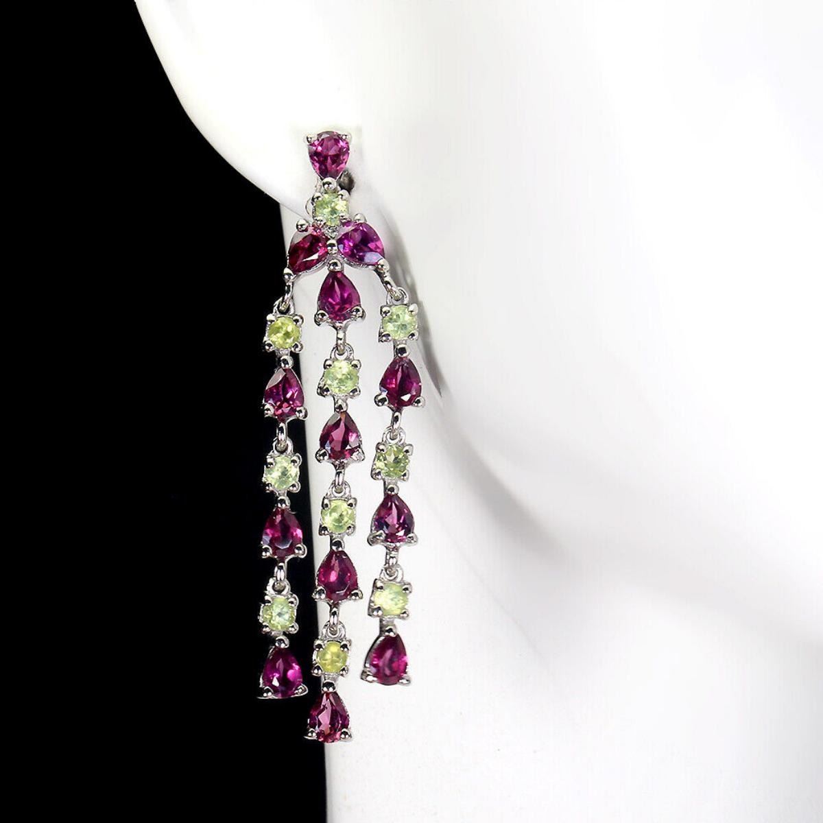 925 STERLING SILVER;PLATE-14K WHITE GOLD;MAIN STONE-RHODOLITE GARNET;OTHER GEMS-PERIDOT;TOTAL WEIGHT-6.92 GRAM (TOTAL WEIGHT OF SILVER + STONE);DIMENSION-* STONE 2.5 TO 4.0 X 3.0 MM.* FACE EARRINGS 47.0 X 11.0 MM.;MAIN STONE SHAPE-PEAR;MAIN STONE COLOR-PINK RASPBERRY;CLARITY/GRADE-IF TO VVS;TREATMENT-UNHEATED;ORIGIN-AFRICA;HARDNESS-7.0 - 7.5;