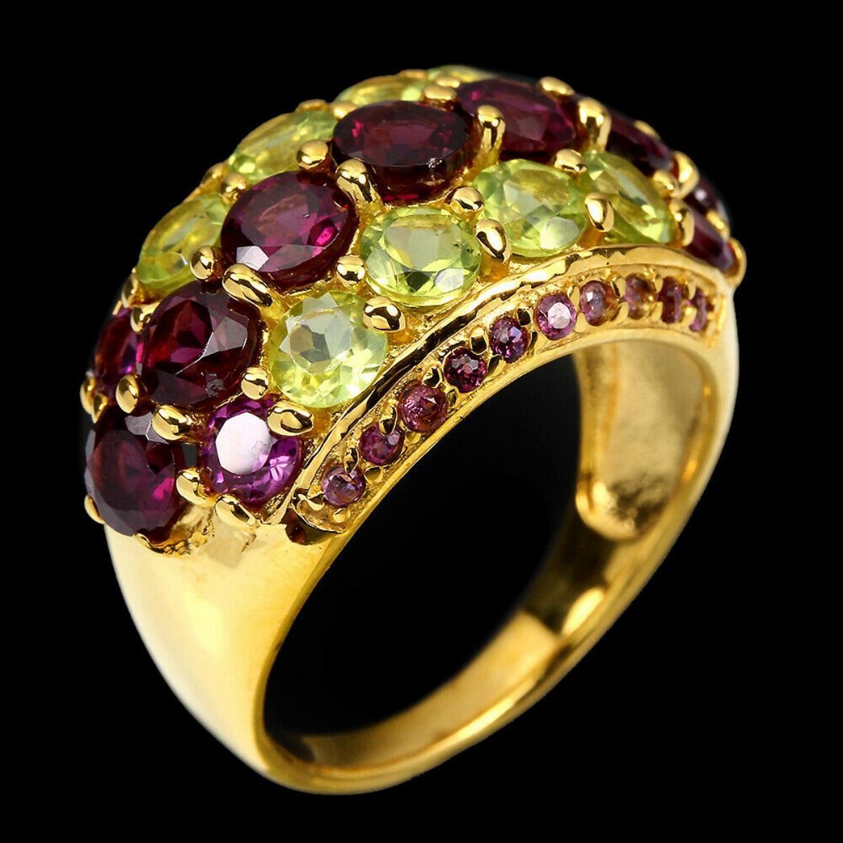 925 STERLING SILVER;PLATE-14K YELLOW GOLD;RING SIZE(resizeable)8.5;MAIN STONE-RHODOLITE GARNET;OTHER GEMS-PERIDOT;TOTAL WEIGHT-8.08 GRAM (TOTAL WEIGHT OF SILVER + STONE)DIMENSION-* STONE 1.5 TO 4.0 MM. * RING SIZE 8.5 * FACE RING 26.0 X 15.0 MM.;MAIN STONE SHAPE-ROUND CUT;MAIN STONE COLOR-TOP RICH PINK RASPBERRY;CLARITY/GRADE-IF TO VVS;TREATMENT-UNHEATED;ORIGIN-AFRICA;HARDNESS-7.0 - 7.5;