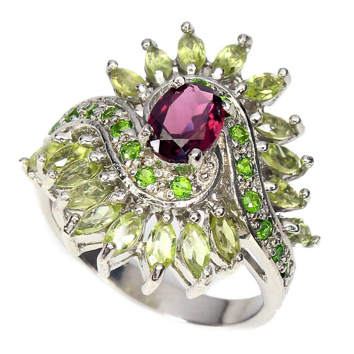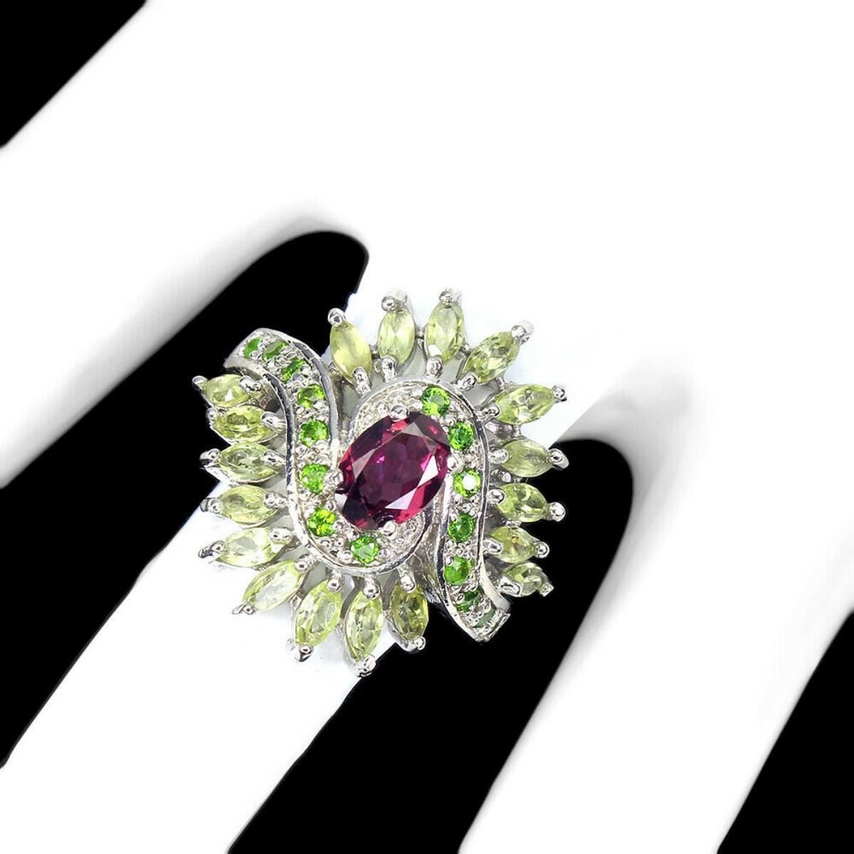 925 STERLING SILVER;PLATE-14K WHITE GOLD;RING SIZE/resizeable -8.5;MAIN STONE-RHODOLITE GARNET;OTHER GEMS-CHROME DIOPSIDE, PERIDOT;TOTAL WEIGHT-5.64 GRAM (TOTAL WEIGHT OF SILVER + STONE)DIMENSION-* STONE 1.5 TO 7.0 X 5.0 MM. * RING SIZE 8.5 * FACE RING- 22.0 X 22.0 MM.;MAIN STONE SHAPE-OVAL CUT;MAIN STONE COLOR- PINK RASPBERRY;CLARITY/GRADE-IF TO VVS;TREATMENT-UNHEATED;ORIGIN-AFRICA;HARDNESS-7.0 - 7.5;