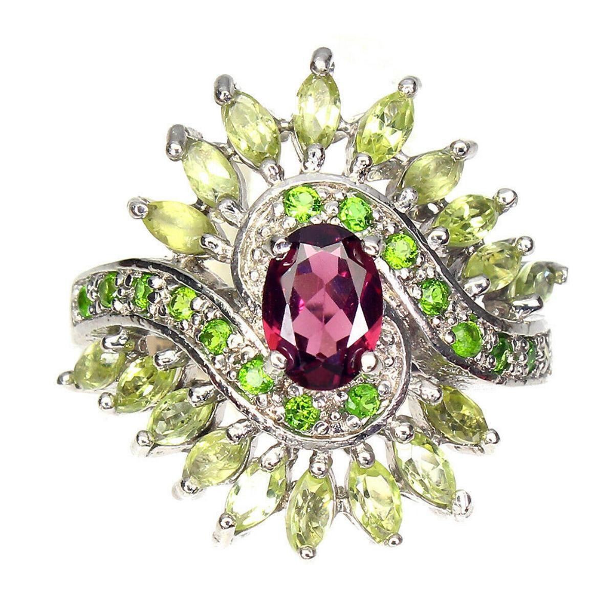 925 STERLING SILVER;PLATE-14K WHITE GOLD;RING SIZE/resizeable -8.5;MAIN STONE-RHODOLITE GARNET;OTHER GEMS-CHROME DIOPSIDE, PERIDOT;TOTAL WEIGHT-5.64 GRAM (TOTAL WEIGHT OF SILVER + STONE)DIMENSION-* STONE 1.5 TO 7.0 X 5.0 MM. * RING SIZE 8.5 * FACE RING- 22.0 X 22.0 MM.;MAIN STONE SHAPE-OVAL CUT;MAIN STONE COLOR- PINK RASPBERRY;CLARITY/GRADE-IF TO VVS;TREATMENT-UNHEATED;ORIGIN-AFRICA;HARDNESS-7.0 - 7.5;