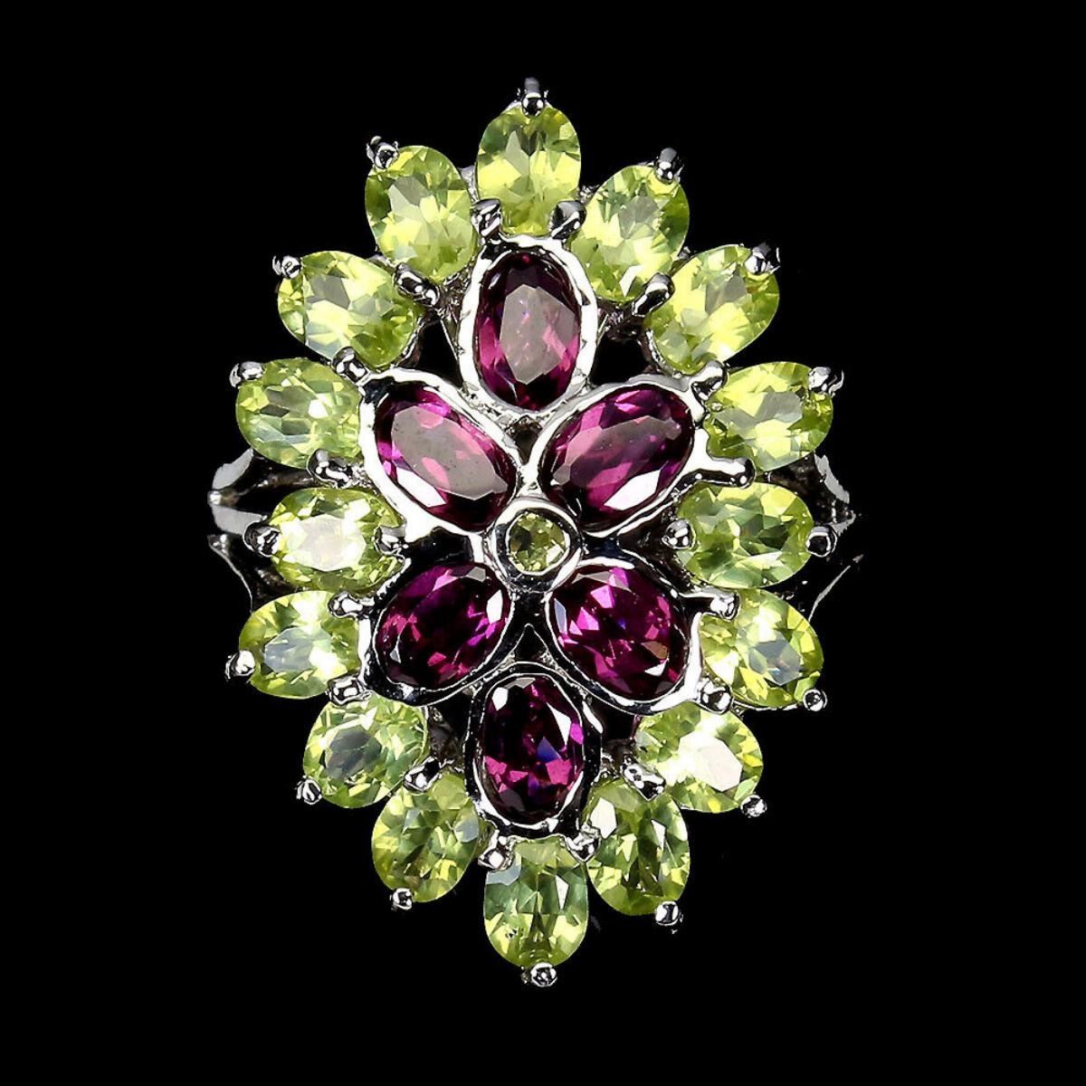 925 STERLING SILVER;PLATE-14K WHITE GOLD;RING SIZE-9.5(RESIZABLE);MAIN STONE-RHODOLITE GARNET;OTHER GEMS-PERIDOT, SAPPHIRE;TOTAL WEIGHT-5.14 GRAM (TOTAL WEIGHT OF SILVER + STONE);DIMENSION-* STONE 2.0 TO 5.0 X 3.0 MM.* RING SIZE 9.5* FACE RING 26.0 X 18.0 MM.;MAIN STONE SHAPE-OVAL; MAIN STONE COLOR-PINK RASPBERRY;CLARITY/GRADE-IF TO VVS;TREATMENT-UNHEATED;ORIGIN-AFRICA;HARDNESS-7.0 - 7.5;