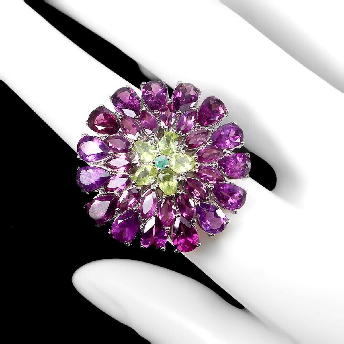925 STERLING SILVER;PLATE-14K WHITE GOLD;RING SIZE/resizeable-8;MAIN STONE-RHODOLITE GARNET;OTHER GEMS-EMERALD, PERIDOT;TOTAL WEIGHT-9.9 GRAM (TOTAL WEIGHT OF SILVER + STONE)DIMENSION-* STONE 2.5 TO 6.0 X 4.0 MM. * RING SIZE 8.0 * FACE RING 28.0 X 28.0 MM.;MAIN STONE SHAPE-PEAR CUT;MAIN STONE COLOR-PINK RASPBERRY;CLARITY/GRADE-IF TO VVS;TREATMENT-UNHEATED;ORIGIN-AFRICA;HARDNESS-7.0 - 7.5;