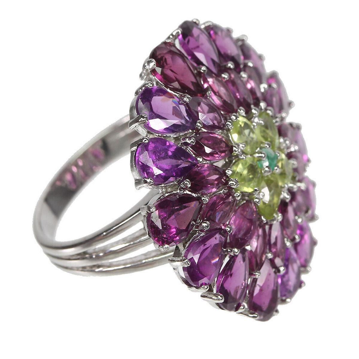 925 STERLING SILVER;PLATE-14K WHITE GOLD;RING SIZE/resizeable-8;MAIN STONE-RHODOLITE GARNET;OTHER GEMS-EMERALD, PERIDOT;TOTAL WEIGHT-9.9 GRAM (TOTAL WEIGHT OF SILVER + STONE)DIMENSION-* STONE 2.5 TO 6.0 X 4.0 MM. * RING SIZE 8.0 * FACE RING 28.0 X 28.0 MM.;MAIN STONE SHAPE-PEAR CUT;MAIN STONE COLOR-PINK RASPBERRY;CLARITY/GRADE-IF TO VVS;TREATMENT-UNHEATED;ORIGIN-AFRICA;HARDNESS-7.0 - 7.5;