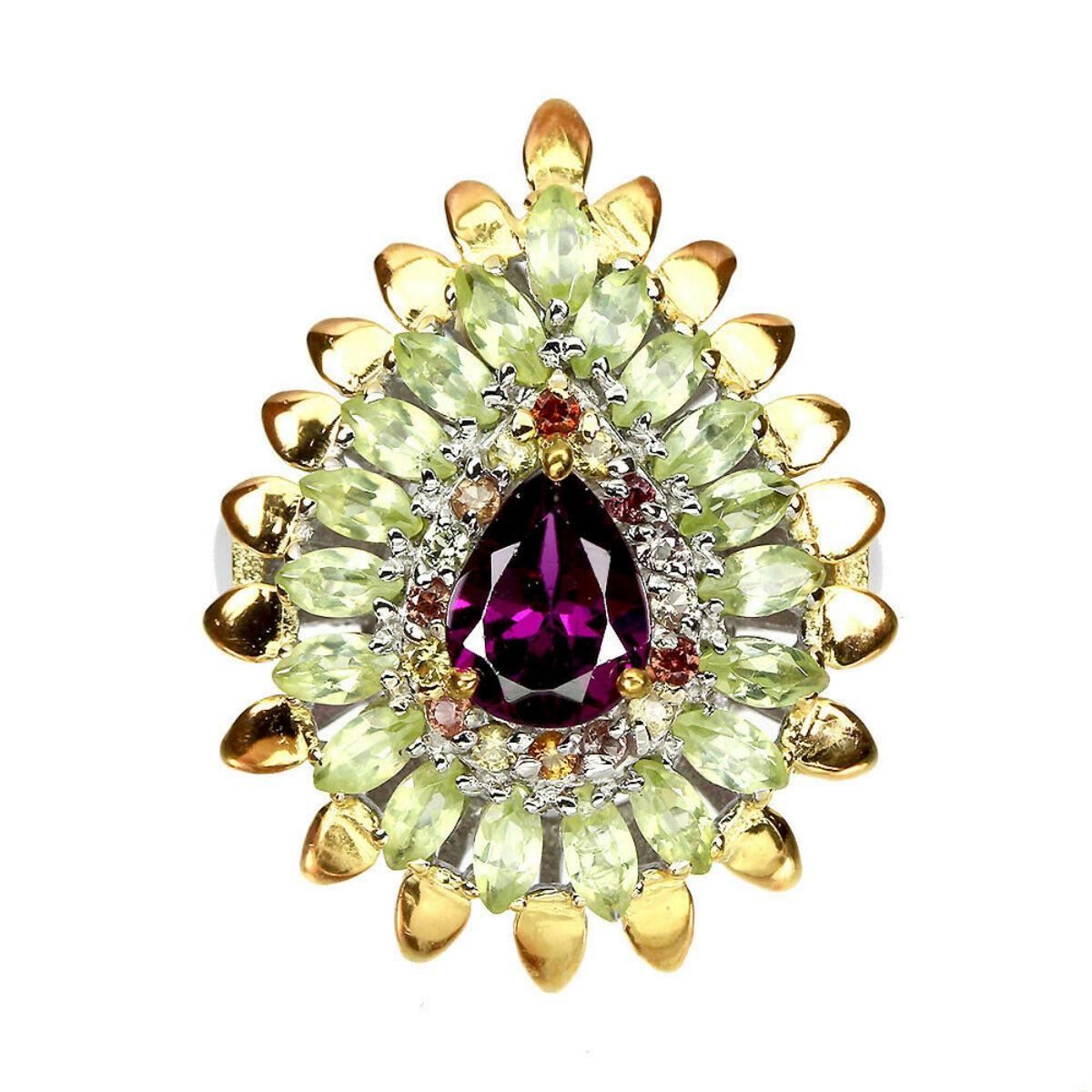 925 STERLING SILVER;PLATE-2-TONE WHITE & YELLOW 14K GOLD;RING SIZE/resizeable - 8;MAIN STONE-RHODOLITE GARNET;OTHER GEMS-PERIDOT, SAPPHIRE DIAMOND CUT;TOTAL WEIGHT-6.73 GRAM (TOTAL WEIGHT OF SILVER + STONE)DIMENSION-* STONE 1.0 TO 8.0 X 6.0 MM.* RING SIZE- 8.0;* FACE RING- 27.0 X 21.0 MM.;MAIN STONE SHAPE-PEAR CUT;MAIN STONE COLOR-PINK RASPBERRY;CLARITY/GRADE-IF;TREATMENT-UNHEATED;ORIGIN-AFRICA;HARDNESS-7.0 - 7.5;