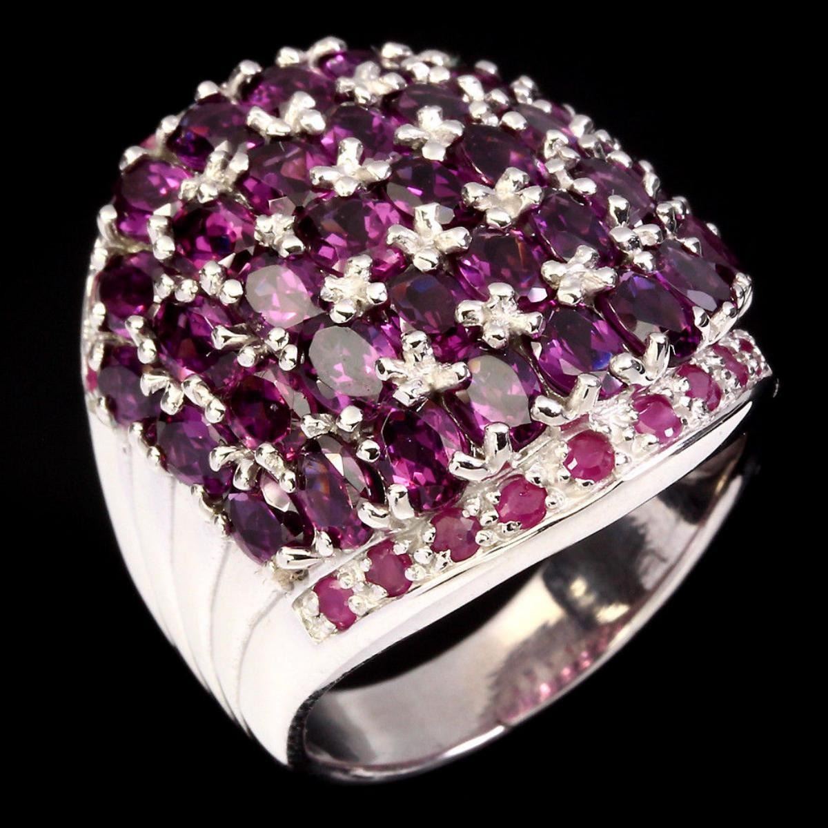 925 STERLING SILVER;PLATE14K WHITE GOLD;RING SIZE/7.5(resizable)MAIN STONERHODOLITE GARNET;OTHER GEMSRUBY;TOTAL WEIGHT49.28 CT (TOTAL WEIGHT OF SILVER + STONE)DIMENSION* STONE 1.0 TO 4.0 X 3.0 MM. * RING SIZE 7.5 * FACE RING 24.0 X 20.0 MM.;MAIN STONE SHAPEOVAL CUT;MAIN STONE COLORTOP RICH PINK RASPBERRY;CLARITY/GRADEIF TO VVS;LUSTERGORGEOUS;TREATMENTUNHEATED;ORIGINAFRICA;HARDNESS7.0 - 9.0;