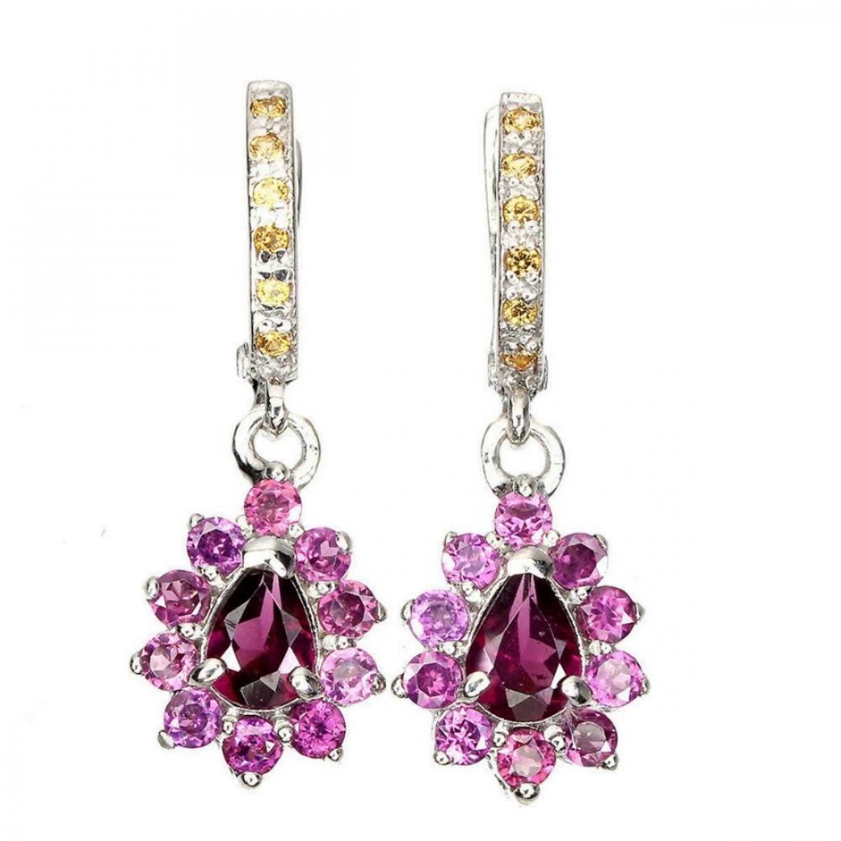 925 STERLING SILVER;PLATE-14K WHITE GOLD;MAIN STONE-RHODOLITE GARNET;OTHER GEMS-SAPPHIRE;TOTAL WEIGHT-5.41 GRAM (TOTAL WEIGHT OF SILVER + STONE)DIMENSION-* STONE 1.5 TO 7.0 X 5.0 MM. * FACE EARRINGS 36.0 X 11.0 MM.;MAIN STONE SHAPE-PEAR CUT;MAIN STONE COLOR-TOP RICH PINK RASPBERRY;CLARITY/GRADE-IF TO VVS;TREATMENT-UNHEATED;ORIGIN-AFRICA;HARDNESS-7.0 - 7.5;