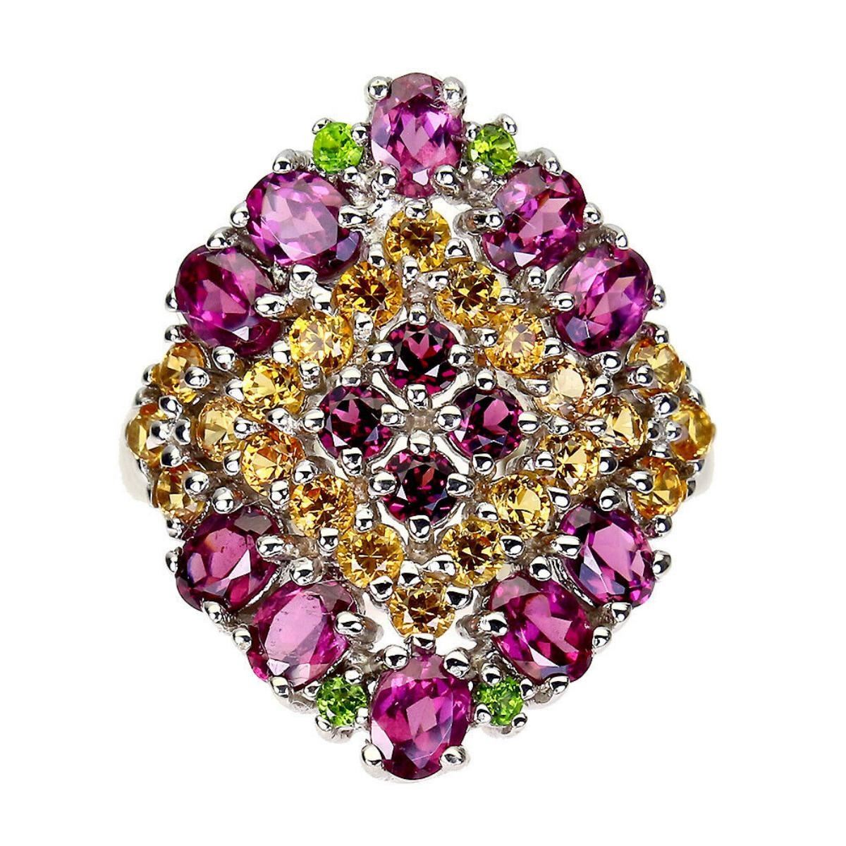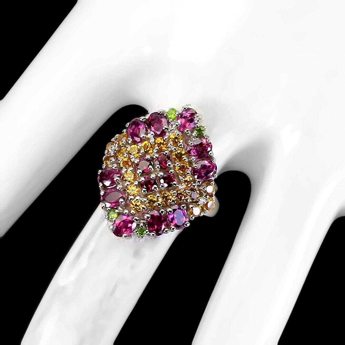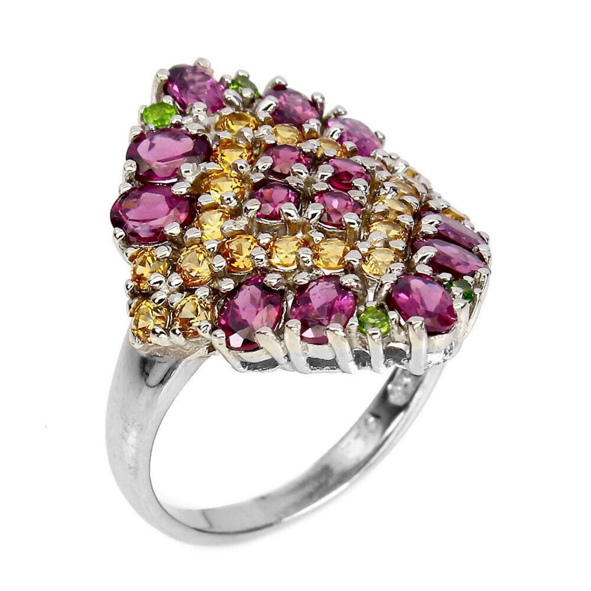 925 STERLING SILVER;PLATE-14K WHITE GOLD;RING SIZE/Resizable-7.5;MAIN STONE-RHODOLITE GARNET;OTHER GEMSCHROME DIOPSIDE, SAPPHIRE;TOTAL WEIGHT-4.58 GRAM (TOTAL WEIGHT OF SILVER + STONE)DIMENSION-* STONE 1.5 TO 4.0 X 3.0 MM.;* RING SIZE -7.5;* FACE RING -23.0 X 20.0 MM.;MAIN STONE SHAPE--PINK RASPBERRY;CLARITY/GRADE-IF TO VVS;TREATMENT-UNHEATED;ORIGIN-AFRICA;