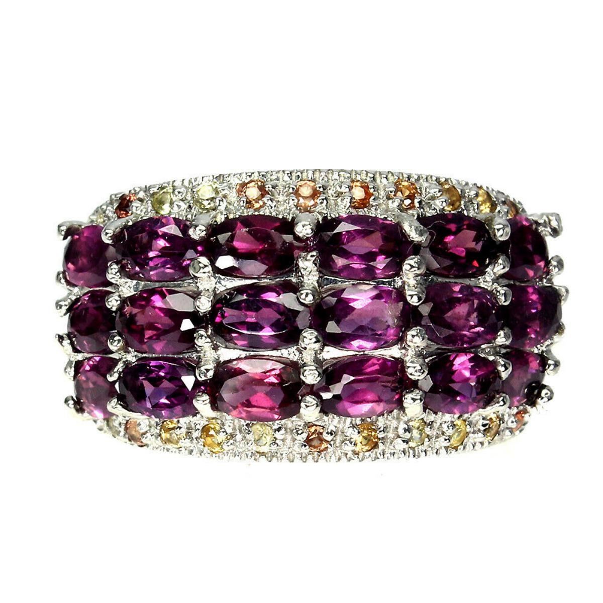 925 STERLING SILVER;PLATE-14K WHITE GOLD;RING SIZE/(resizeable)8;MAIN STONE-RHODOLITE GARNET;OTHER GEMS-SAPPHIRE;TOTAL WEIGHT-9.89 GRAM (TOTAL WEIGHT OF SILVER + STONE)DIMENSION-* STONE 1.0 TO 5.0 X 3.0 MM. * RING SIZE 8.0 * FACE RING- 25.0 X 14.0 MM.;MAIN STONE SHAPE-OVAL CUT;MAIN STONE COLOR-TOP RICH PINK RASPBERRY;CLARITY/GRADE-IF TO VVS;TREATMENT-UNHEATED;ORIGIN-AFRICA;HARDNESS-7.0 - 7.5;