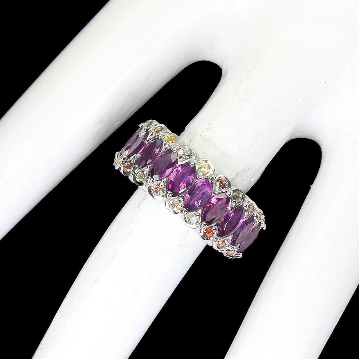 925 STERLING SILVER;PLATE-14K WHITE GOLD;RING SIZE/resizeable-7.5;MAIN STONE-RHODOLITE GARNET;OTHER GEMS-SAPPHIRE;TOTAL WEIGHT-10.23 GRAM (TOTAL WEIGHT OF SILVER + STONE)DIMENSION-* STONE 2.0 TO 6.0 X 3.0 MM. * RING SIZE 7.5 * FACE RING -25.0 X 10.0 MM.;MAIN STONE SHAPE-MARQUISE CUT;MAIN STONE COLOR-PINK RASPBERRY;CLARITY/GRADE-IF TO VVS;TREATMENT-UNHEATED;ORIGIN-AFRICA;HARDNESS-7.0 - 7.5;