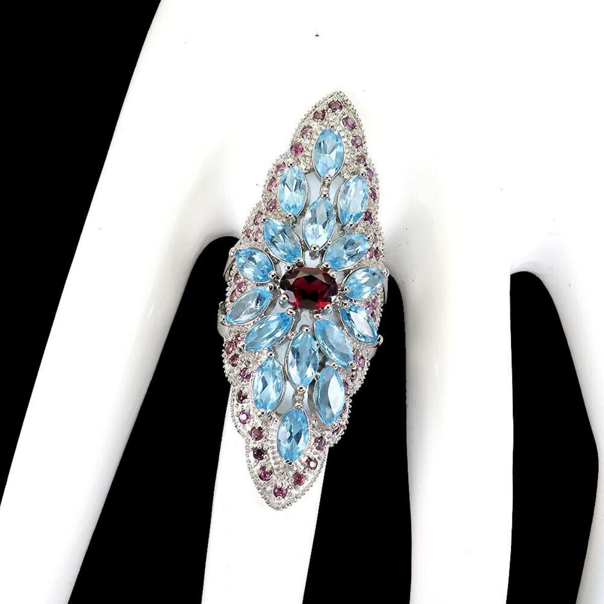 925 STERLING SILVER;PLATE-14K WHITE GOLD;RING SIZE-8(RESIZABLE);MAIN STONE-RHODOLITE GARNET;OTHER GEMS-SWISS BLUE TOPAZ;TOTAL WEIGHT-11.72 GRAM (TOTAL WEIGHT OF SILVER + STONE);DIMENSION-* STONE 1.5 TO 7.0 X 5.0 MM.* RING SIZE 8.0* FACE RING 53.0 X 20.0 MM.;MAIN STONE SHAPE-OVAL; MAIN STONE COLOR-PINK RASPBERRY;CLARITY/GRADE-IF TO VVS;TREATMENT-UNHEATED;ORIGIN-AFRICA;HARDNESS-7.0 - 7.5;