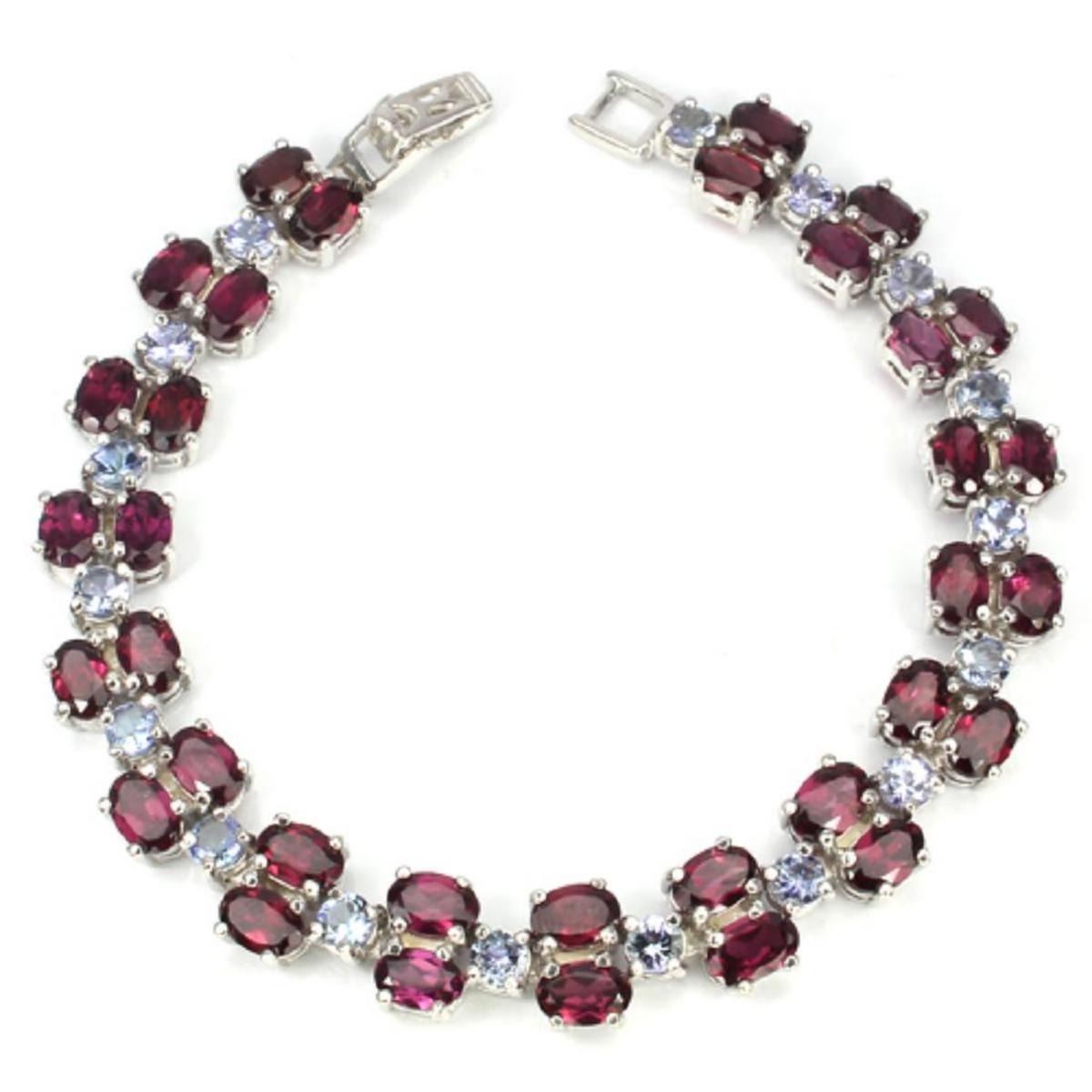 RHODOLITE GARNET & TANZANITE (NATURAL) 14K WHITE GOLD COATING 925 SILVER BRACELETUNIT OF ITEM (S):1 PIECEWEIGHT (CT.):105.77 CT. (total weight of silver + stone)DIMENSION:* STONE 3.0 TO 6.0 X 4.0 MM. * LENGTH 7.5 INCHES. * FACE BRACELET 170.0 X 10.0 MM.SHAPE/CUT:OVAL FACET & ROUND DIAMOND CUTCOLOR:TOP RICH PINK RASPBERRY & TOP NICE BLUE VIOLETCLARITY/GRADE:IF TO VVSLUSTER:MESMERIZINGTREATMENT:UNHEATEDORIGIN:AFRICA & TANZANIA - AFRICAHARDNESS:7.0 - 7.5