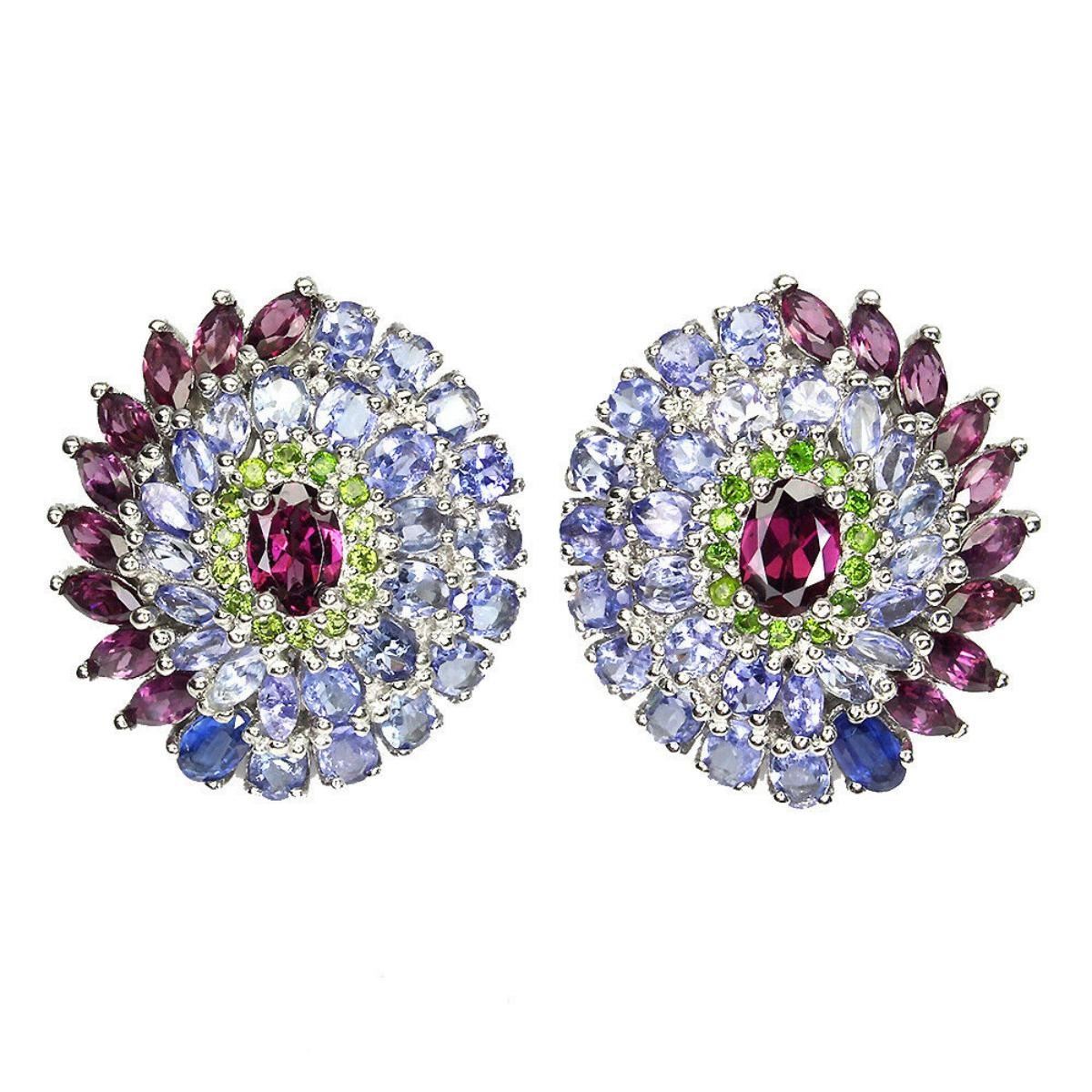 925 STERLING SILVER;PLATE-14K WHITE GOLD;MAIN STONE-RHODOLITE GARNET;OTHER GEMS-CHROME DIOPSIDE, TANZANITE;TOTAL WEIGHT-14.38 GRAM (TOTAL WEIGHT OF SILVER + STONE);DIMENSION-* STONE 1.5 TO 7.0 X 5.0 MM. * FACE EARRINGS 27.0 X 24.0 MM.;MAIN STONE SHAPE-OVAL; MAIN STONE COLOR-PINK RASPBERRY;CLARITY/GRADE-IF TO VVS;TREATMENT-UNHEATED;ORIGIN-AFRICA;HARDNESS-7.0 - 7.5;