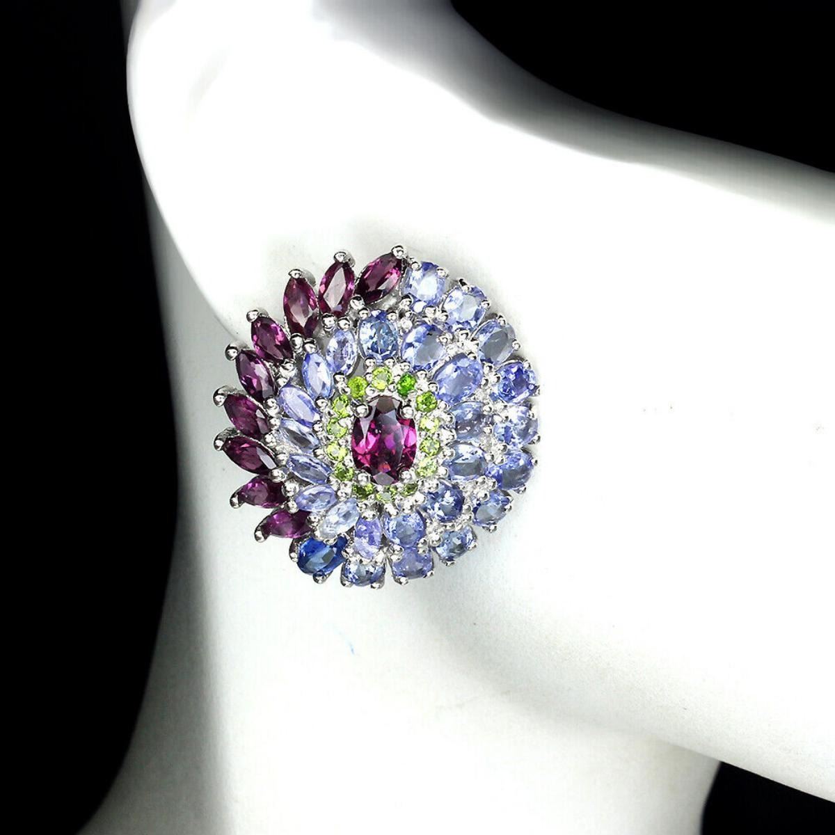 925 STERLING SILVER;PLATE-14K WHITE GOLD;MAIN STONE-RHODOLITE GARNET;OTHER GEMS-CHROME DIOPSIDE, TANZANITE;TOTAL WEIGHT-14.38 GRAM (TOTAL WEIGHT OF SILVER + STONE);DIMENSION-* STONE 1.5 TO 7.0 X 5.0 MM. * FACE EARRINGS 27.0 X 24.0 MM.;MAIN STONE SHAPE-OVAL; MAIN STONE COLOR-PINK RASPBERRY;CLARITY/GRADE-IF TO VVS;TREATMENT-UNHEATED;ORIGIN-AFRICA;HARDNESS-7.0 - 7.5;