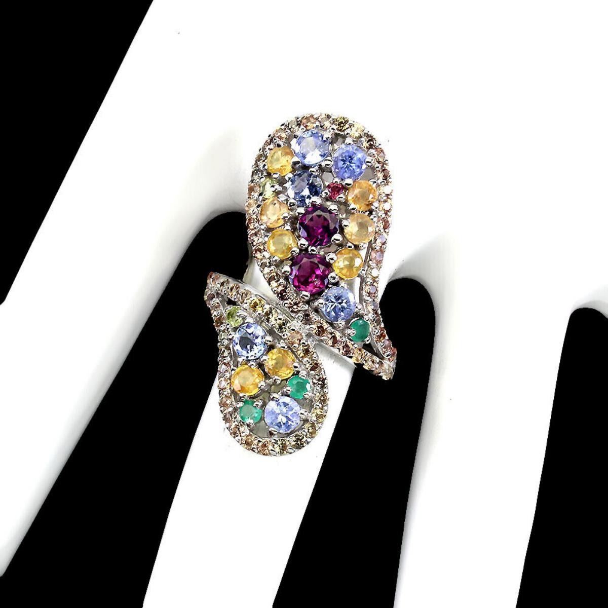 925 STERLING SILVER;PLATE-14K WHITE GOLD;RING SIZE/resizeable-8.5;MAIN STONE-RHODOLITE GARNET;OTHER GEMS-EMERALD, SAPPHIRE, TANZANITE;TOTAL WEIGHT-6.11 GRAM (TOTAL WEIGHT OF SILVER + STONE)DIMENSION-* STONE 1.5 TO 4.0 MM.;* RING SIZE- 8.5;* FACE RING -35.0 X 20.0 MM.;MAIN STONE SHAPE-ROUND CUT;MAIN STONE COLOR- PINK RASPBERRY;CLARITY/GRADE-IF TO VVS;TREATMENT-UNHEATED;ORIGIN-AFRICA;HARDNESS-7.0 - 7.5;