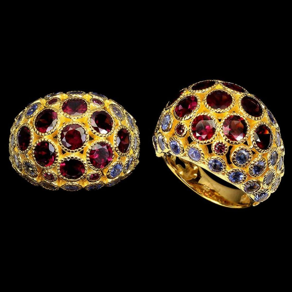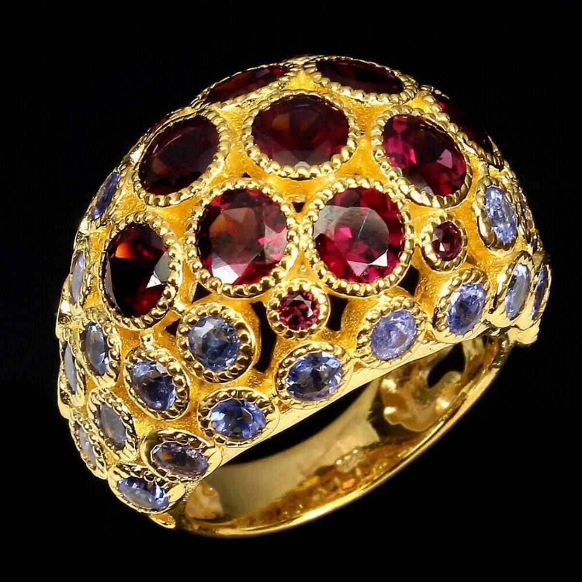 925 STERLING SILVER;PLATE-14K YELLOW GOLD;RING SIZE/(resizeable)7;MAIN STONE-RHODOLITE GARNET;OTHER GEMS-TANZANITE;TOTAL WEIGHT-11.4 GRAM (TOTAL WEIGHT OF SILVER + STONE)DIMENSION-* STONE 2.0 TO 5.0 MM. * RING SIZE 7.0 * FACE RING 26.0 X 19.0 MM.;MAIN STONE SHAPE-ROUND CUT;MAIN STONE COLORTOP RICH PINK RASPBERRY;CLARITY/GRADE- IF TO VVS;- - TREATMENT- UNHEATED;ORIGIN -AFRICA;HARDNESS- 7.0 - 7.5;