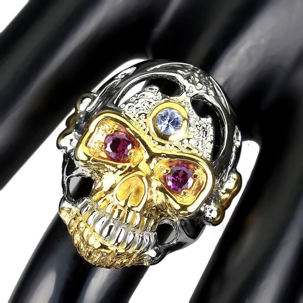 925 STERLING SILVER;PLATE-2-TONE WHITE & YELLOW 14K GOLD;RING SIZE/Resizeable-9;MAIN STONE-RHODOLITE GARNET;OTHER GEMS-TANZANITE;TOTAL WEIGHT-13.39 GRAM (TOTAL WEIGHT OF SILVER + STONE)DIMENSION-* STONE 3.5 MM. * RING SIZE 9.0 * FACE RING 30.0 X 25.0 MM.;MAIN STONE SHAPE-ROUND CUT;MAIN STONE COLOR- PINK RASPBERRY;CLARITY/GRADE-IF TO VVS;TREATMENT-UNHEATED;ORIGIN-AFRICA;HARDNESS-7;