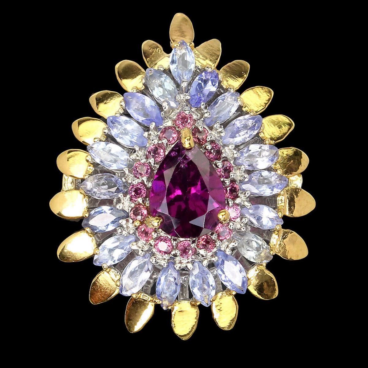 925 STERLING SILVER;PLATE-2-TONE WHITE & YELLOW 14K GOLD;RING SIZE/Resizeable-9;MAIN STONE-RHODOLITE GARNET;OTHER GEMS-TANZANITE;TOTAL WEIGHT-6.63 GRAM (TOTAL WEIGHT OF SILVER + STONE)DIMENSION-* STONE 1.5 TO 8.0 X 6.0 MM.;* FACE RING- 27.0 X 21.0 MM.;MAIN STONE SHAPE-PEAR CUT;MAIN STONE COLOR-PINK RASPBERRY;CLARITY/GRADE-IF TO VVS;TREATMENT-UNHEATED;ORIGIN-AFRICA;HARDNESS-7.0 - 7.5;