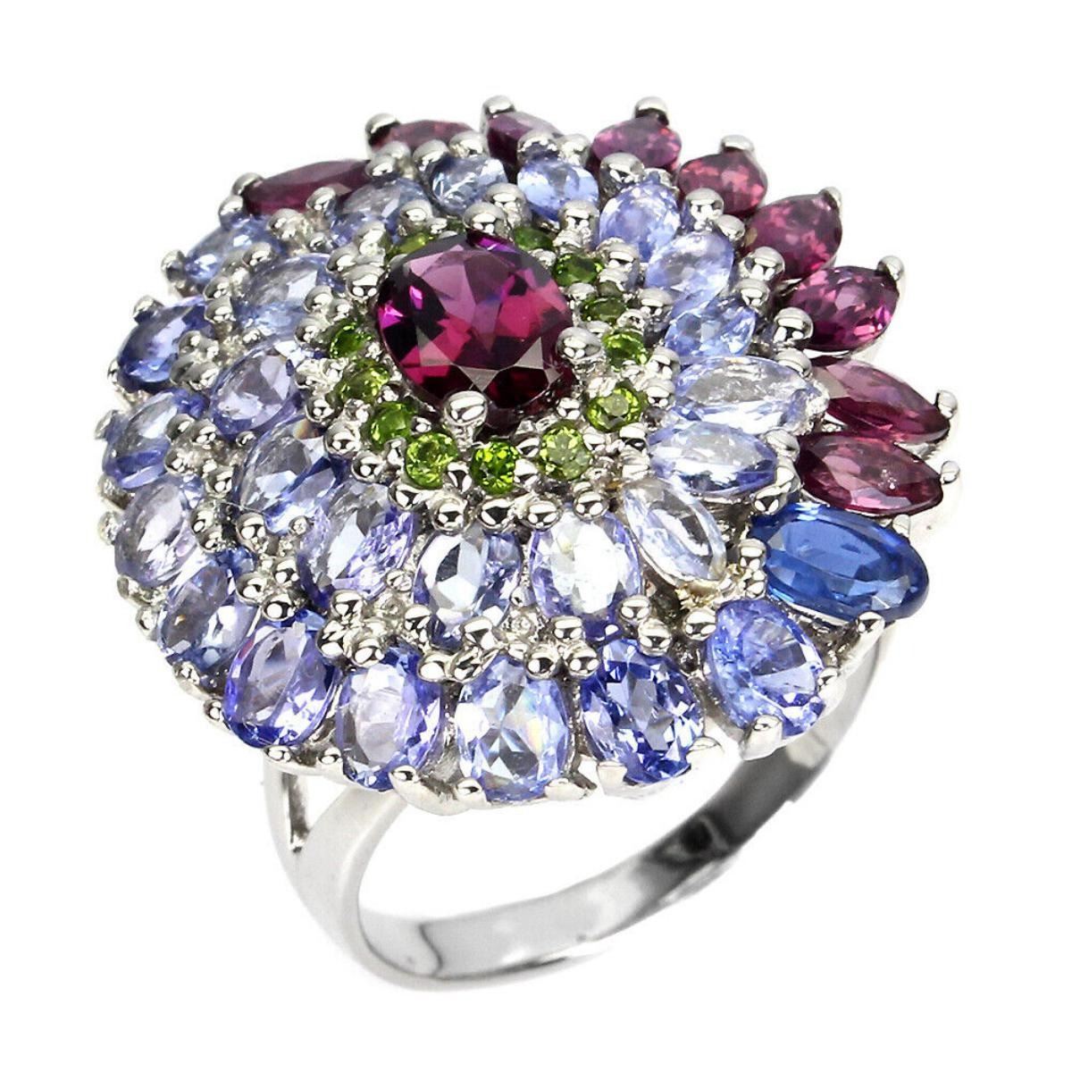 925 STERLING SILVER;PLATE-14K WHITE GOLD;RING SIZE-8(RESIZABLE);MAIN STONE-RHODOLITE GARNET;OTHER GEMS-CHROME DIOPSIDE, TANZANITE;TOTAL WEIGHT-9.5 GRAM (TOTAL WEIGHT OF SILVER + STONE);DIMENSION-* STONE 1.5 TO 7.0 X 5.0 MM. * RING SIZE 8.0 * FACE RING 27.0 X 24.0 MM.;MAIN STONE SHAPE-OVAL ;MAIN STONE COLOR-PINK RASPBERRY;CLARITY/GRADE-IF TO VVS;TREATMENT-UNHEATED;ORIGIN-AFRICA;HARDNESS-7.0 - 7.5;