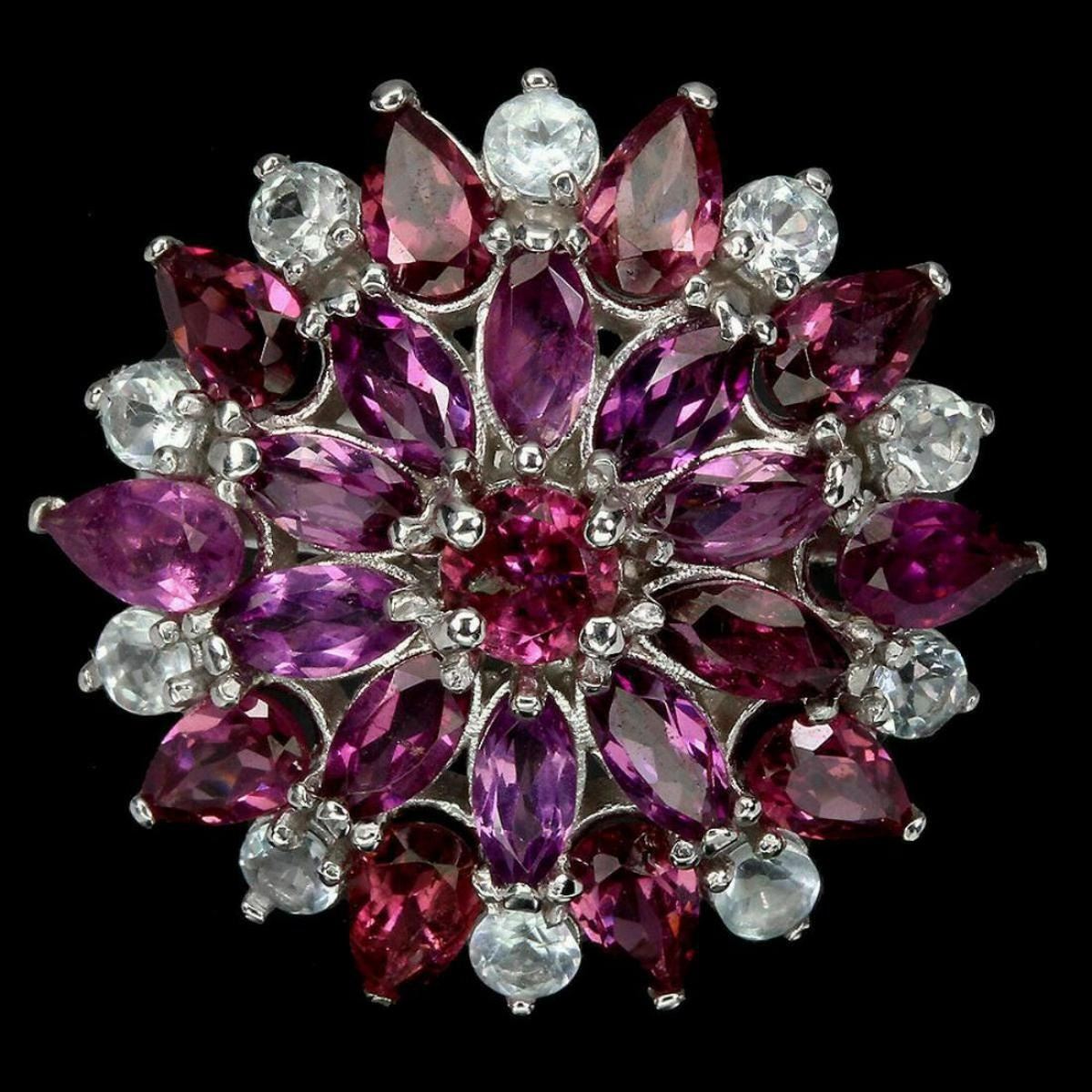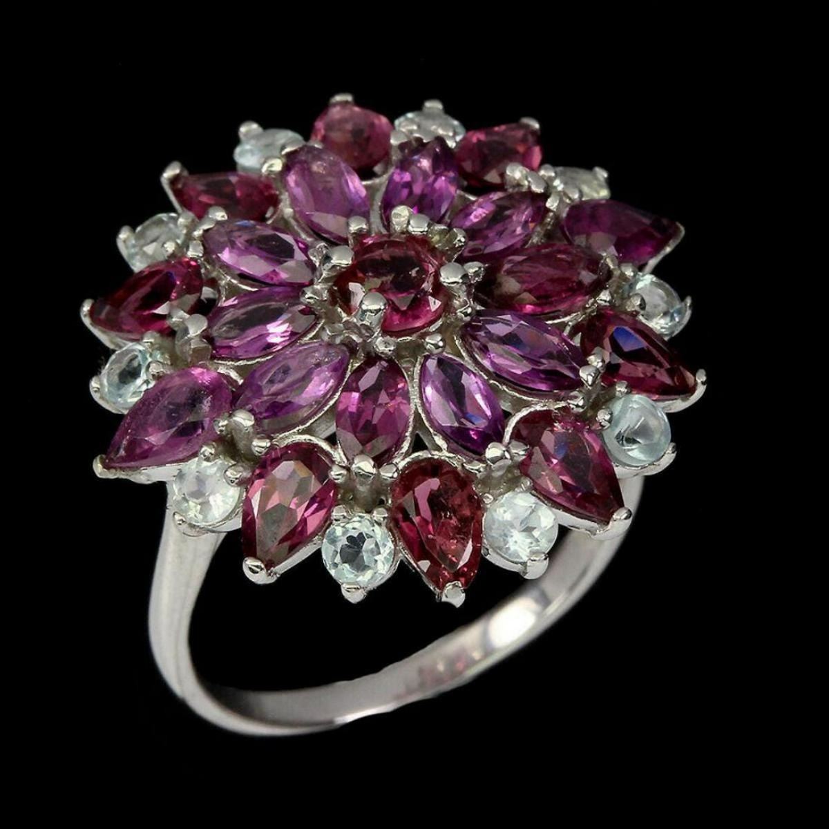 925 STERLING SILVER;PLATE-14K WHITE GOLD;RING SIZE-8(resizeable);MAIN STONE-RHODOLITE GARNET;OTHER GEMS-TANZANITE, TOURMALINE;TOTAL WEIGHT-5.23 GRAM (TOTAL WEIGHT OF SILVER + STONE)DIMENSION* STONE 2.5 TO 5.0 X 3.0 MM. * FACE RING 23.0 X 22.0 MM.;MAIN STONE SHAPE-MARQUISE CUT;MAIN STONE COLOR-TOP RICH PINK RASPBERRY;CLARITY/GRADE-IF TO VVS;TREATMENT-UNHEATED;ORIGIN-AFRICA;HARDNESS-7.0 - 7.5;