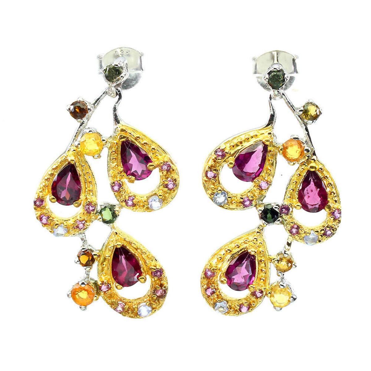 925 STERLING SILVER;PLATE-2-TONE WHITE & YELLOW 14K GOLD;MAIN STONE-RHODOLITE GARNET;OTHER GEMS-TANZANITE, TOURMALINE;TOTAL WEIGHT-7.07 GRAM (TOTAL WEIGHT OF SILVER + STONE);DIMENSION* -STONE 1.5 TO 6.0 X 4.0 MM.* FACE EARRINGS 34.0 X 20.0 MM.;MAIN STONE SHAPE-PEAR CUT;MAIN STONE COLOR-PINK RASPBERRY;CLARITY/GRADE-IF TO VVS;TREATMENT-UNHEATED;ORIGIN-AFRICA;HARDNESS-7.0 - 7.5;