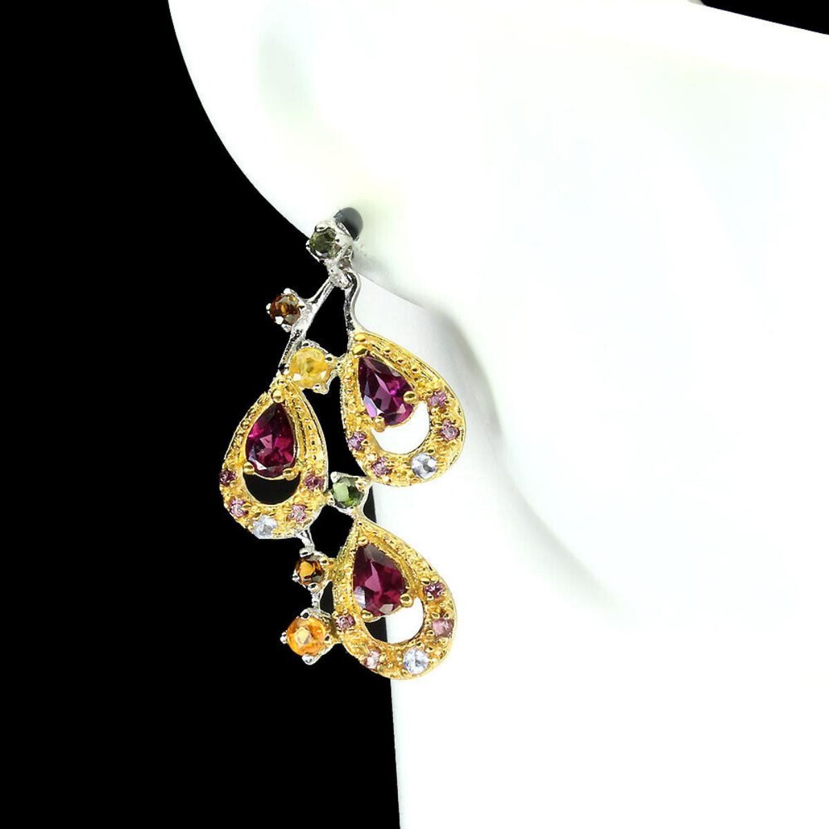 925 STERLING SILVER;PLATE-2-TONE WHITE & YELLOW 14K GOLD;MAIN STONE-RHODOLITE GARNET;OTHER GEMS-TANZANITE, TOURMALINE;TOTAL WEIGHT-7.07 GRAM (TOTAL WEIGHT OF SILVER + STONE);DIMENSION* -STONE 1.5 TO 6.0 X 4.0 MM.* FACE EARRINGS 34.0 X 20.0 MM.;MAIN STONE SHAPE-PEAR CUT;MAIN STONE COLOR-PINK RASPBERRY;CLARITY/GRADE-IF TO VVS;TREATMENT-UNHEATED;ORIGIN-AFRICA;HARDNESS-7.0 - 7.5;