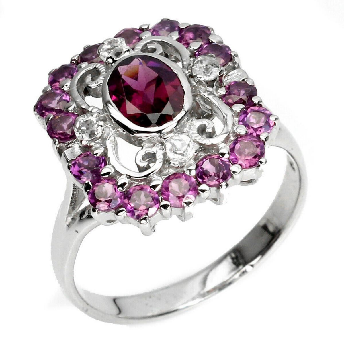 925 STERLING SILVER;PLATE-14K WHITE GOLD;RING SIZE/(resizeable)9;MAIN STONE-RHODOLITE GARNET;OTHER GEMS-WHITE TOPAZ;TOTAL WEIGHT-5.12 GRAM (TOTAL WEIGHT OF SILVER + STONE)DIMENSION-* STONE 2.0 TO 7.0 X 5.0 MM. * RING SIZE 9.0 * FACE RING- 17.0 X 15.0 MM.;MAIN STONE SHAPE-OVAL CUT;MAIN STONE COLOR- PINK RASPBERRY;CLARITY/GRADE-IF TO VVS;TREATMENT-UNHEATED;ORIGIN-AFRICA;HARDNESS-7.0 - 7.5;