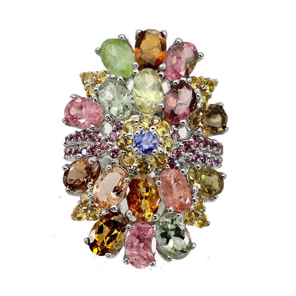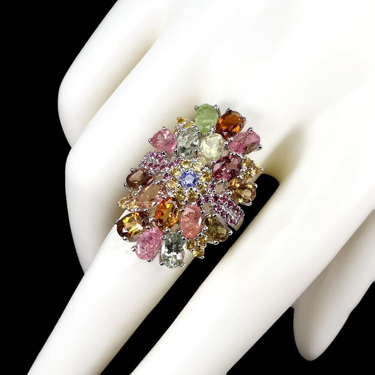 925 STERLING SILVER;PLATE-14 K WHITE GOLD;RING SIZE-9.5(RESIZABLE);MAIN STONE-TOURMALINE;OTHER GEMS-RHODOLITE GARNET, SAPPHIRE, TANZANITE;TOTAL WEIGHT-7.72 GRAM (TOTAL WEIGHT OF SILVER + STONE);DIMENSION-* STONE 1.5 TO 6.0 X 4.0 MM.* RING SIZE 9.5* FACE RING 32.0 X 21.0 MM.;MAIN STONE SHAPE-OVAL;MAIN STONE COLOR-MULTI-COLOR;CLARITY/GR-ADE-IF TO VVS;TREATMENT-UNHEATED;ORIGIN-BRAZIL;HARDNESS-7.0-7.5;