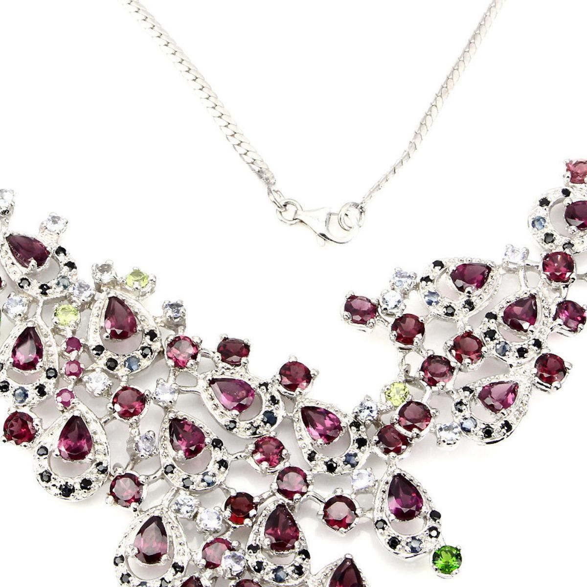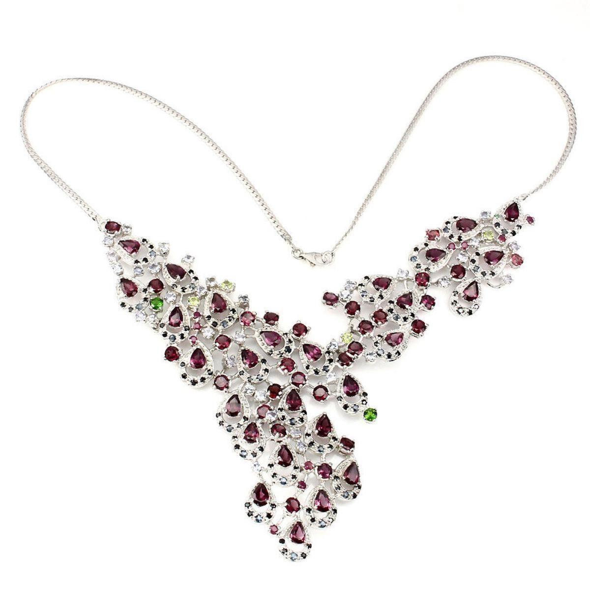 925 STERLING SILVER; PLATE -14K WHITE GOLD; LENGTH (INCHES) -18; MAIN STONE -RHODOLITE GARNET; OTHER GEMS -CHROME DIOPSIDE,PERIDOT,RUBY,SAPPHIRE,SPINEL,TANZANITE; TOTAL WEIGHT 216.07 CT (TOTAL WEIGHT OF SILVER + STONE) DIMENSION * STONE 1.0 TO 6.0 X 4.0 MM. * STONES PART LENGTH 120.0 X 72.0 MM. MAIN STONE SHAPE PEAR CUT MAIN STONE COLOR TOP RICH PINK RASPBERRY CLARITY/GRADE IF TO VVS LUSTER LUXURIOUS TREATMENT UNHEATED ORIGIN AFRICA HARDNESS 6.5 - 9.0