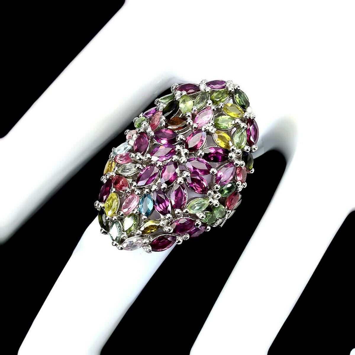 925 STERLING SILVER;PLATE-14K WHITE GOLD;RING SIZE(resizeable)7.5;MAIN STONE-RHODOLITE GARNET;OTHER GEMS-TOURMALINE;TOTAL WEIGHT-11.12 GRAM (TOTAL WEIGHT OF SILVER + STONE)DIMENSION-* STONE 4.0 X 2.0 TO 5.0 X 2.5 MM. * RING SIZE 7.5 * FACE RING -34.0 X 22.0 MM.;MAIN STONE SHAPE-MARQUISE CUT;MAIN STONE COLOR-PINK RASPBERRY;CLARITY/GRADE-IF TO VVS;TREATMENT-UNHEATED;ORIGIN-AFRICA;HARDNESS-7;