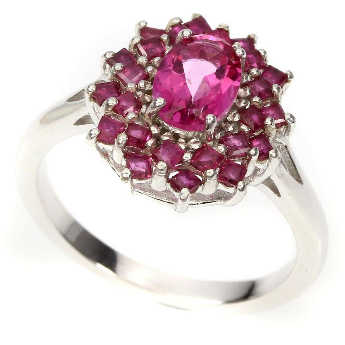 Main Stone Shape:Oval CutBase Metal:Fine Silver, 925 parts per 1000Main Stone Color:AAA Rich PinkStyle:Solitaire with Accents;Metal Purity:925 parts per 1000Secondary Stone:RubyRing Size:8.5Luster:CharmingPlate:14k White Gold;Treatment:Heated/Treated;Origin:Brazil;Hardness:8