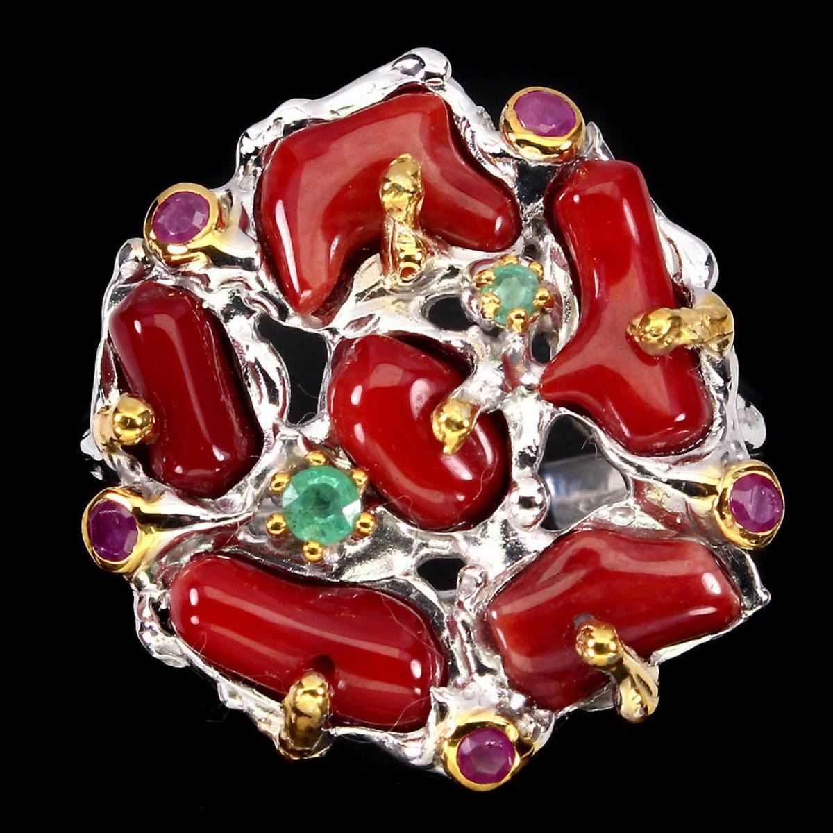 925 STERLING SILVERPLATE2-TONE WHITE & YELLOW 14K GOLDRING SIZE8 (resizeable)MAIN STONECORALOTHER GEMSEMERALD,RUBYTOTAL WEIGHT49.03 CT (TOTAL WEIGHT OF SILVER + STONE)DIMENSION* STONE 1.5 TO 10.0 X 5.0 MM. * FACE RING 25.0 X 23.0 MM.MAIN STONE SHAPEFANCY CABOCHONMAIN STONE COLORTOP RICH REDCLARITY/GRADEOPAQUELUSTERMESMERIZINGTREATMENTUNHEATED;ORIGINCROATIA;HARDNESS3.0 - 9.0;