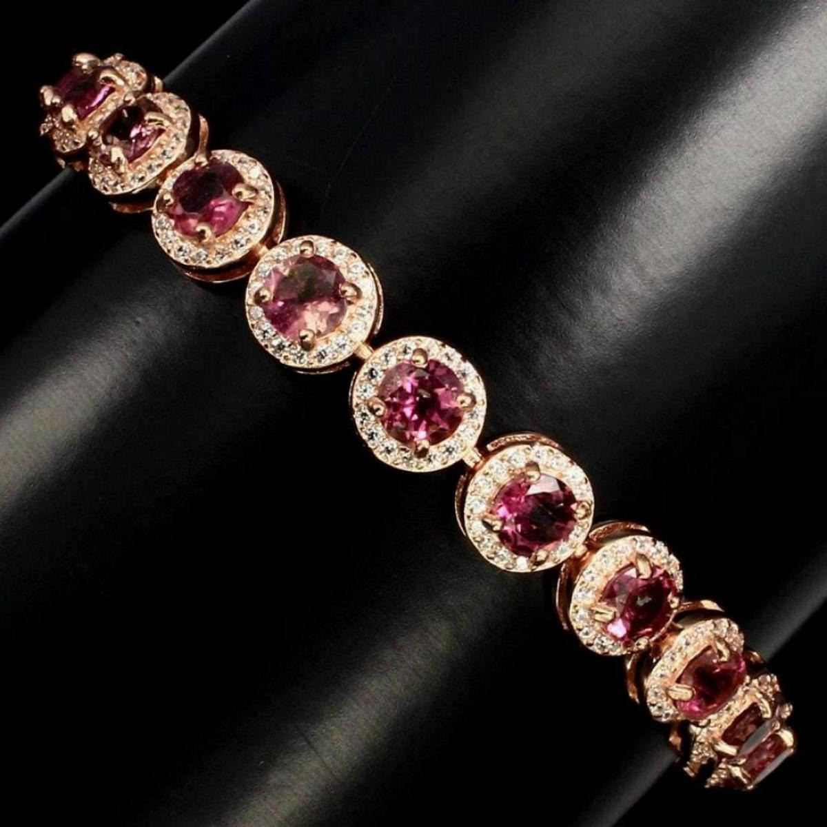 925 STERLING SILVER;PLATE14K ROSE GOLD;LENGTH (INCHES)8;MAIN STONE TOURMALINE;TOTAL WEIGHT 72.18 CT (TOTAL WEIGHT OF SILVER + STONE)DIMENSION* STONE 5.0 MM. * CZ 1.0 MM. * FACE BRACELET 190.0 X 8.0 MM.MAIN STONE SHAPE ROUND CUTMAIN STONE COLORTOP RICH PINK CLARITY/GRADEIF TO VVS LUSTER PRECIOUS TREATMENT UNHEATED ORIGIN BRAZIL HARDNESS 7.0 - 7.5