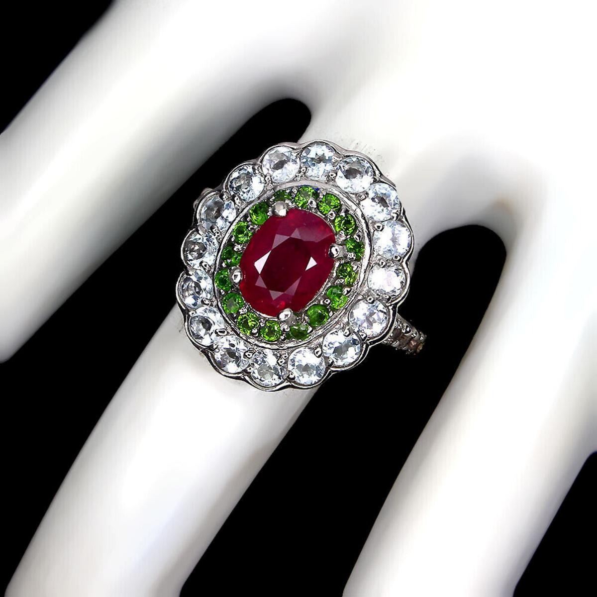925 STERLING SILVER;PLATE-14K WHITE GOLD;RING SIZE-8(RESIZABLE);MAIN STONE-RUBY;OTHER GEMS-AQUAMARINE, CHROME DIOPSIDE, SAPPHIRE;TOTAL WEIGHT-6.76 GRAM (TOTAL WEIGHT OF SILVER + STONE);DIMENSION-* STONE 2.0 TO 9.0 X 7.0 MM.* RING SIZE 8.0* FACE RING 21.0 X 19.0 MM.;MAIN STONE SHAPE-OVAL CUT;MAIN STONE COLOR-BLOOD RED;TREATMENT-YES;ORIGIN-MADAGASCAR;HARDNESS- 9.0;