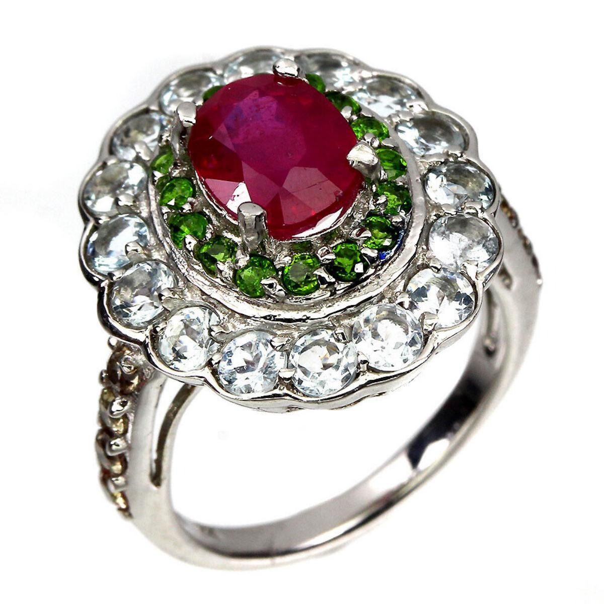 925 STERLING SILVER;PLATE-14K WHITE GOLD;RING SIZE-8(RESIZABLE);MAIN STONE-RUBY;OTHER GEMS-AQUAMARINE, CHROME DIOPSIDE, SAPPHIRE;TOTAL WEIGHT-6.76 GRAM (TOTAL WEIGHT OF SILVER + STONE);DIMENSION-* STONE 2.0 TO 9.0 X 7.0 MM.* RING SIZE 8.0* FACE RING 21.0 X 19.0 MM.;MAIN STONE SHAPE-OVAL CUT;MAIN STONE COLOR-BLOOD RED;TREATMENT-YES;ORIGIN-MADAGASCAR;HARDNESS- 9.0;