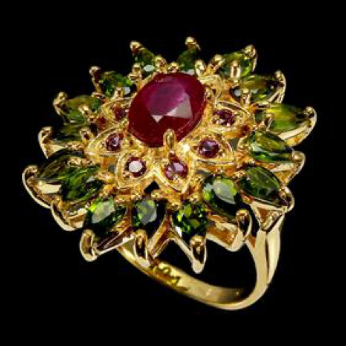 925 STERLING SILVER;PLATE-14K YELLOW GOLD;RING SIZE-(Resizeable)8;MAIN STONE-RUBY;OTHER GEMS-CHROME DIOPSIDE, RHODOLITE GARNET;TOTAL WEIGHT-8.55 GRAM (TOTAL WEIGHT OF SILVER + STONE)DIMENSION-* STONE 2.0 TO 8.0 X 6.0 MM. * RING SIZE 8.0 * FACE RING- 28.0 X 26.0 MM.;MAIN -STONE SHAPEOVAL CUT;MAIN- STONE COLORTOP BLOOD REDTREATMENT of Ruby - Yes; all other stones are natural untreated ;ORIGIN-MADAGASCAR;HARDNESS-9;