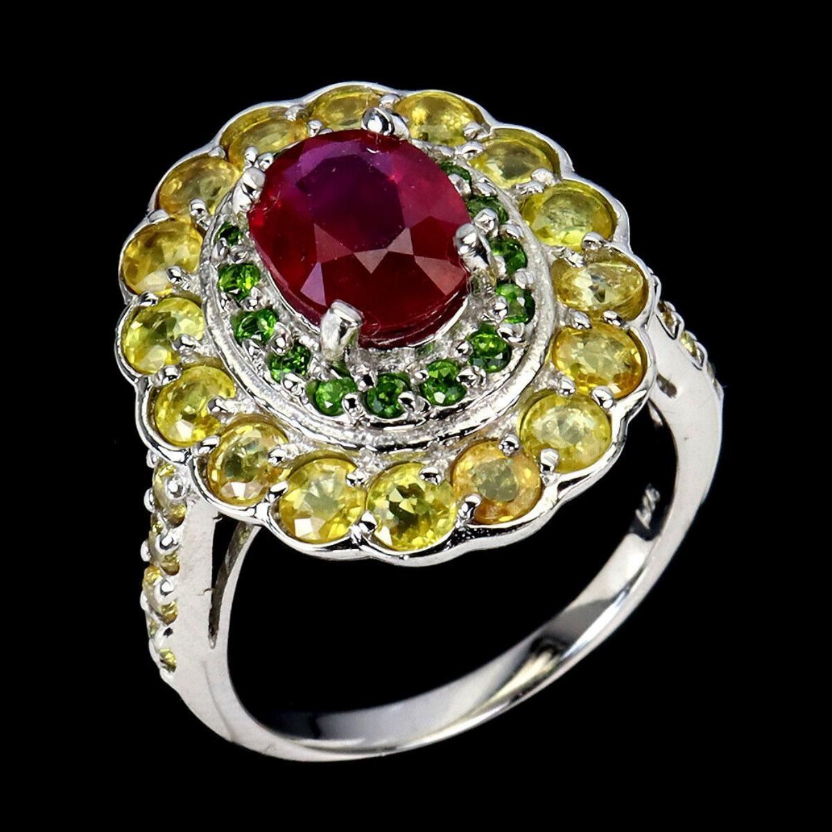 925 STERLING SILVER;PLATE-14K WHITE GOLD;RING SIZE-8.5(RESIZABLE);MAIN STONE-RUBY;OTHER GEMS-CHROME DIOPSIDE, SAPPHIRE;TOTAL WEIGHT-6.95 GRAM (TOTAL WEIGHT OF SILVER + STONE);DIMENSION-* STONE 1.5 TO 9.0 X 7.0 MM.* RING SIZE 8.5* FACE RING 22.0 X 21.0 MM.;MAIN STONE SHAPE-OVAL CUT;MAIN STONE COLOR-BLOOD RED;TREATMENT- YES;ORIGIN-MADAGASCAR;HARDNESS-9;