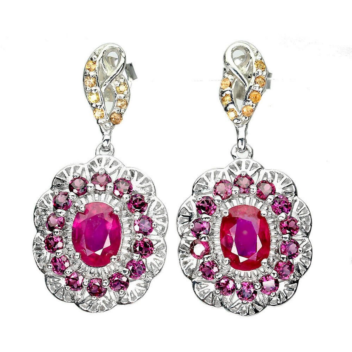 925 STERLING SILVER;PLATE-14K WHITE GOLD;MAIN STONE-RUBY;OTHER GEMS-RHODOLITE GARNET, SAPPHIRE;TOTAL WEIGHT-7.28 GRAM (TOTAL WEIGHT OF SILVER + STONE);DIMENSION-* STONE 1.0 TO 8.0 X 6.0 MM.* FACE EARRINGS 33.0 X 16.0 MM.;MAIN STONE SHAPE-OVAL CUT;MAIN STONE COLOR- BLOOD RED;TREATMENT -YES;ORIGIN-MADAGASCAR;HARDNESS-9.0;