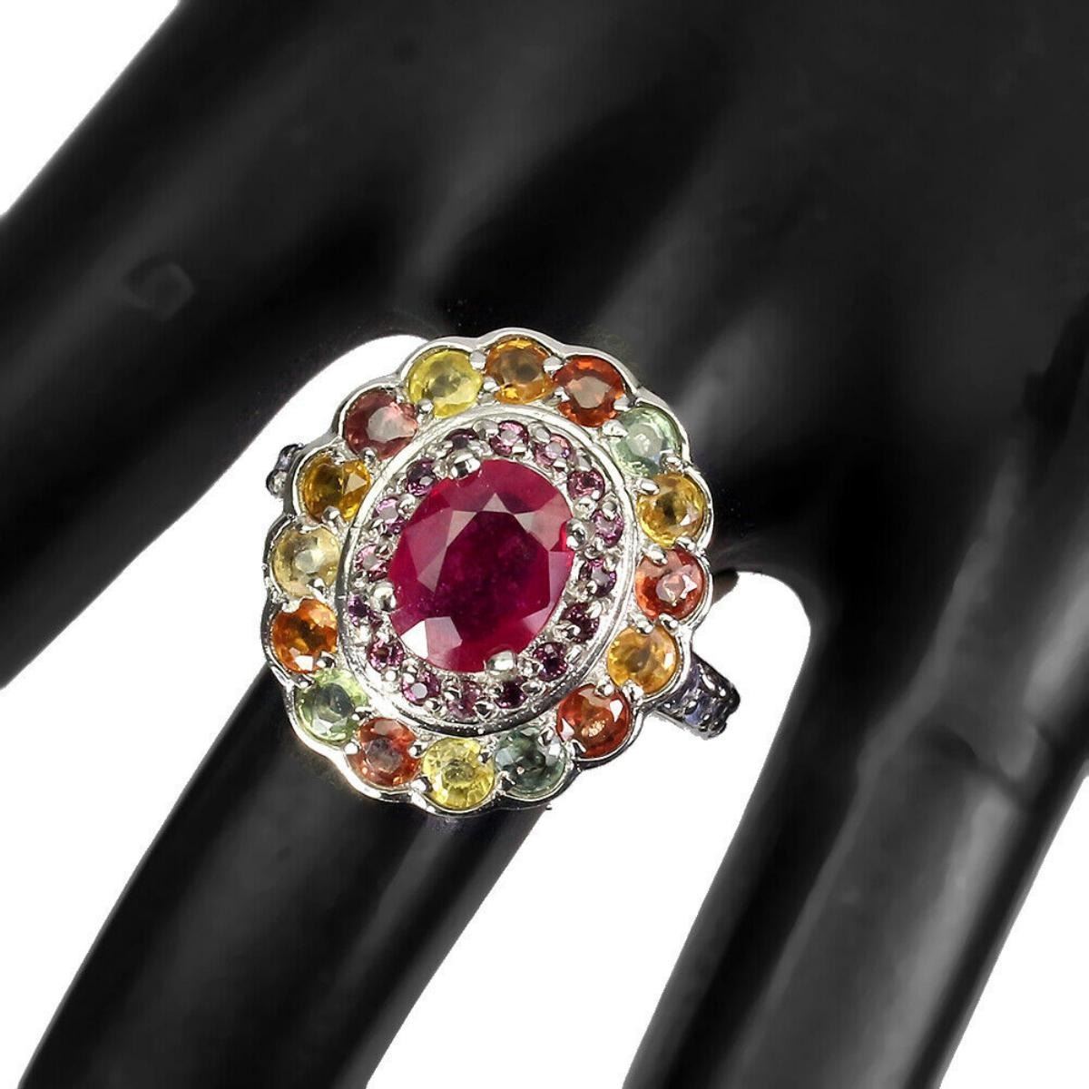 925 STERLING SILVER;PLATE-14K WHITE GOLD;RING SIZE-8.5(RESIZABLE);MAIN STONE-RUBY;OTHER GEMS-RHODOLITE GARNET, SAPPHIRE, TANZANITE;TOTAL WEIGHT-7.35 GRAM (TOTAL WEIGHT OF SILVER + STONE);DIMENSION- * STONE 2.0 TO 9.0 X 7.0 MM.* RING SIZE 8.5* FACE RING 23.0 X 21.0 MM.;MAIN STONE SHAPE-OVAL CUT;MAIN STONE COLOR-BLOOD RED;TREATMENT-YES;ORIGIN-MADAGASCAR;HARDNESS-9.0;