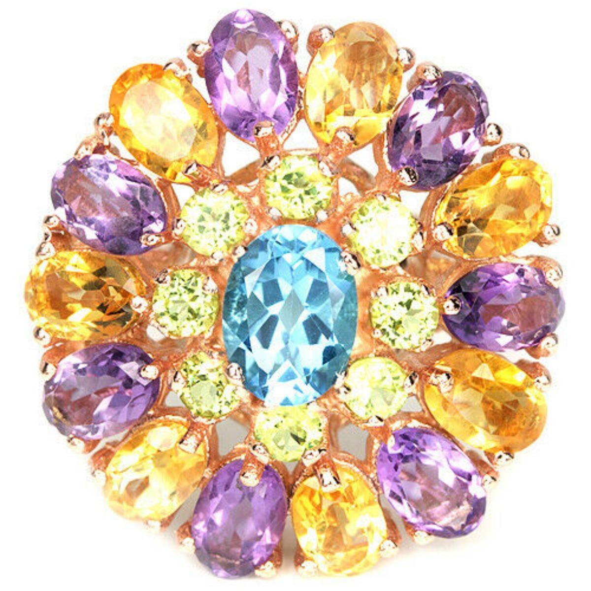 Total Carat Weight (TCW):54Metal Purity:925 parts per 1000Main Stone Treatment:IrradiationSizable:YesSecondary Stone:Amethyst, Citrine, Peridot, RubyMetal:Sterling SilverMain Stone:Topaz;Main Stone Shape:OvalMain Stone Color:BlueTotal Carat Weight:8.80Main Stone Creation:NaturalMAIN STONE SIZE:7.9 X 5.9 X 3.9 MM.Ring Size:7.5(resizeable)Style:Cocktail