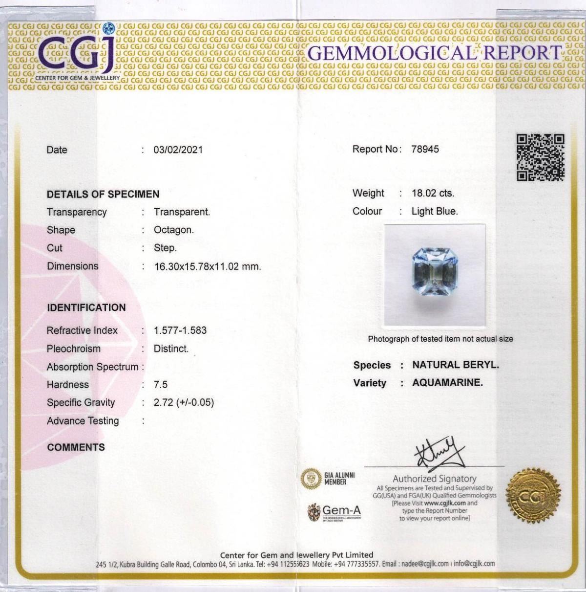 Natural Santa Maria Aquamarine 18.01 Cts - VVS.......size 16.30 x 15.79 x 11.05 MM.........completely untreated...Naturally earth mined ......Certified.