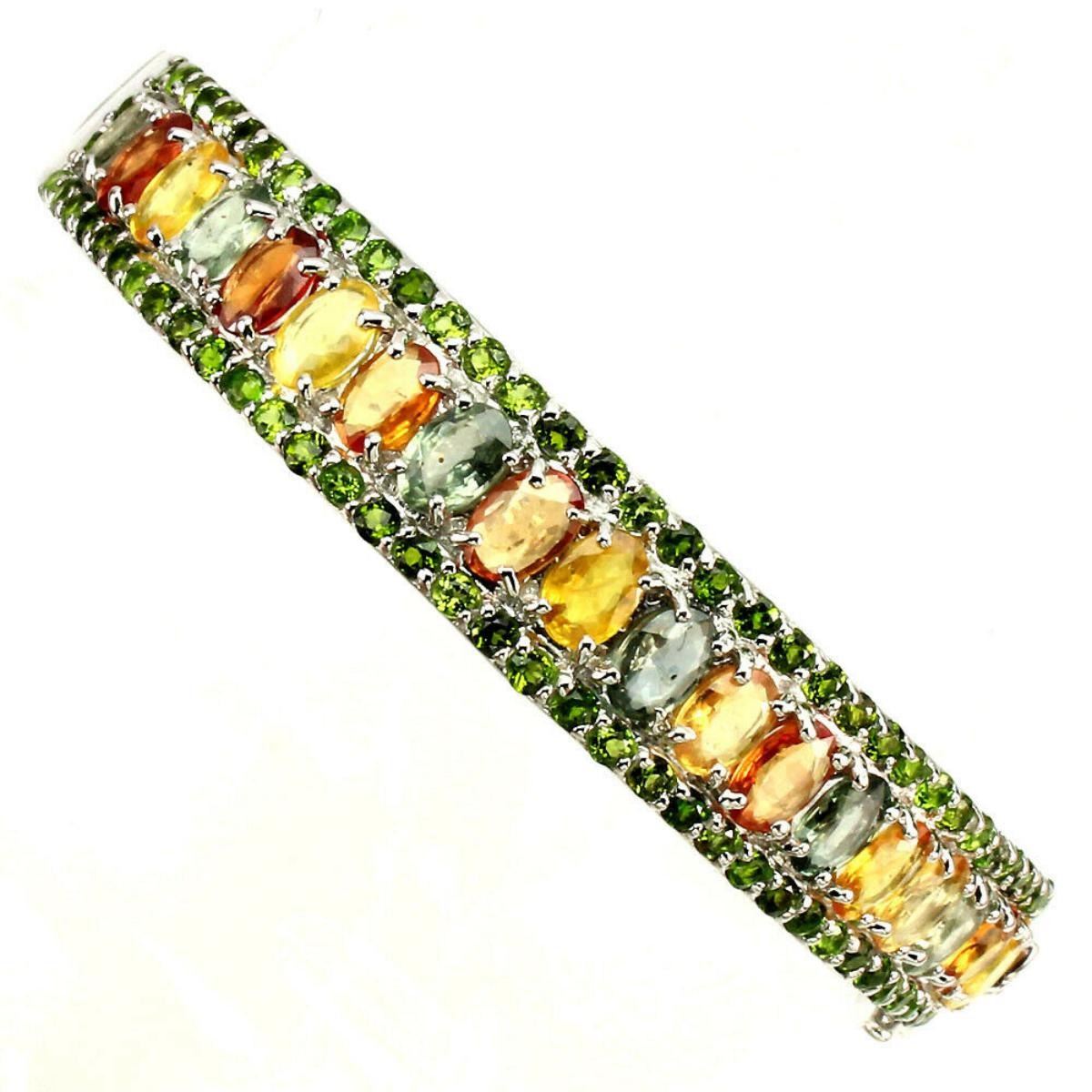 925 STERLING SILVER;PLATE...14K WHITE GOLD;LENGTH (INCHES)2.2;MAIN STONE-SAPPHIRE;OTHER GEMS-CHROME DIOPSIDE;TOTAL WEIGHT-96.64 CT (TOTAL WEIGHT OF SILVER + STONE)DIMENSION* STONE 1.5 TO 6.0 X 4.0 MM. * DIAMETER 2.2 X 2.1 INCHES. * FACE BANGLE 26.0 X 10.0 MM.;MAIN STONE SHAPE-OVAL CUT;MAIN STONE COLOR-MULTI-COLOR;CLARITY/GRADE-IF TO VVS;ORIGIN- Ceylon;HARDNESS-9;