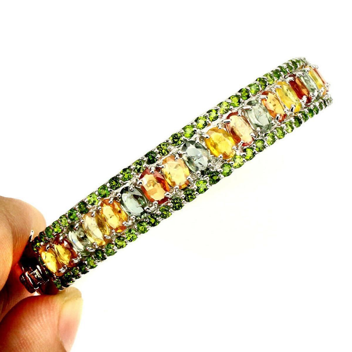 925 STERLING SILVER;PLATE...14K WHITE GOLD;LENGTH (INCHES)2.2;MAIN STONE-SAPPHIRE;OTHER GEMS-CHROME DIOPSIDE;TOTAL WEIGHT-96.64 CT (TOTAL WEIGHT OF SILVER + STONE)DIMENSION* STONE 1.5 TO 6.0 X 4.0 MM. * DIAMETER 2.2 X 2.1 INCHES. * FACE BANGLE 26.0 X 10.0 MM.;MAIN STONE SHAPE-OVAL CUT;MAIN STONE COLOR-MULTI-COLOR;CLARITY/GRADE-IF TO VVS;ORIGIN- Ceylon;HARDNESS-9;