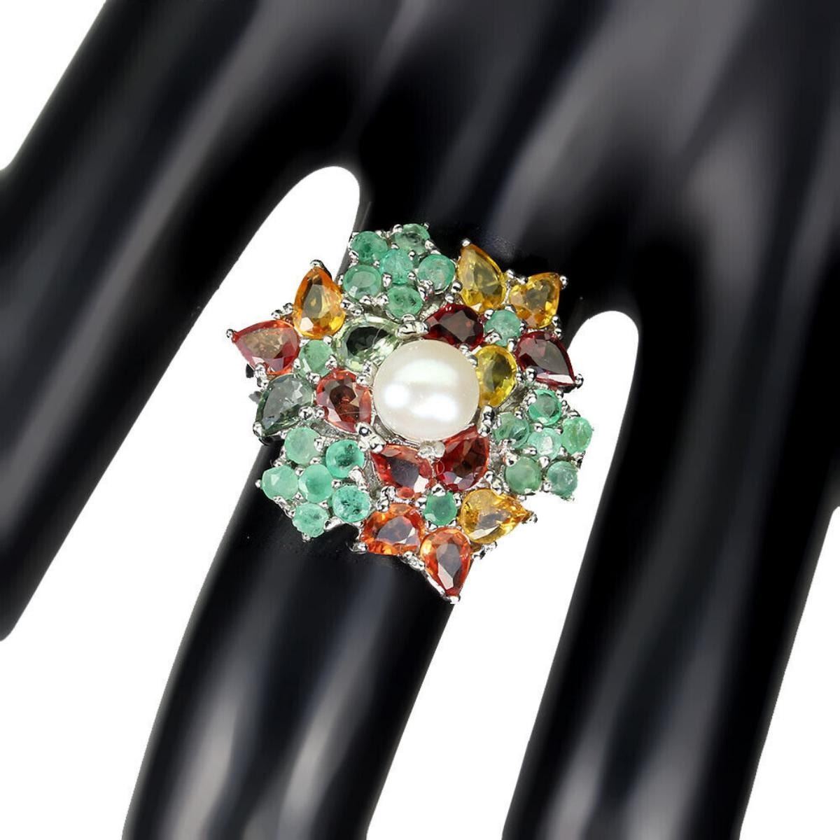 925 STERLING SILVER;PLATE-14K WHITE GOLD;RING SIZE-8(RESIZABLE);MAIN STONE-SAPPHIRE;OTHER GEMS-EMERALD, PEARL;TOTAL WEIGHT-5.33 GRAM (TOTAL WEIGHT OF SILVER + STONE);DIMENSION-* STONE 2.0 TO 4.0 X 3.0 MM. * PEARL 6.0 MM. * RING SIZE 8.0 * FACE RING 22.0 X 21.0 MM.;MAIN STONE SHAPE-PEAR; MAIN STONE COLOR-MULTI-COLOR;CLARITY/GRADE-IF TO VVS;ORIGINSONGEA - AFRICA;HARDNESS-9;
