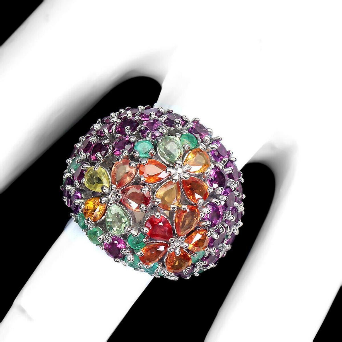 925 STERLING SILVER;PLATE-14K WHITE GOLD;RING SIZE-8(RESIZABLE);MAIN STONE-SAPPHIRE;OTHER GEMS-EMERALD, RHODOLITE GARNET;TOTAL WEIGHT-9.21 GRAM (TOTAL WEIGHT OF SILVER + STONE);DIMENSION-* STONE 2.0 TO 4.0 X 3.0 MM. * RING SIZE 8.0 * FACE RING 21.0 X 21.0 MM.;MAIN STONE SHAPE-PEAR CUT;MAIN STONE COLOR-MULTI-COLOR;CLARITY/GRADE-IF TO VVS;ORIGIN-SONGEA - AFRICA;HARDNESS-9;