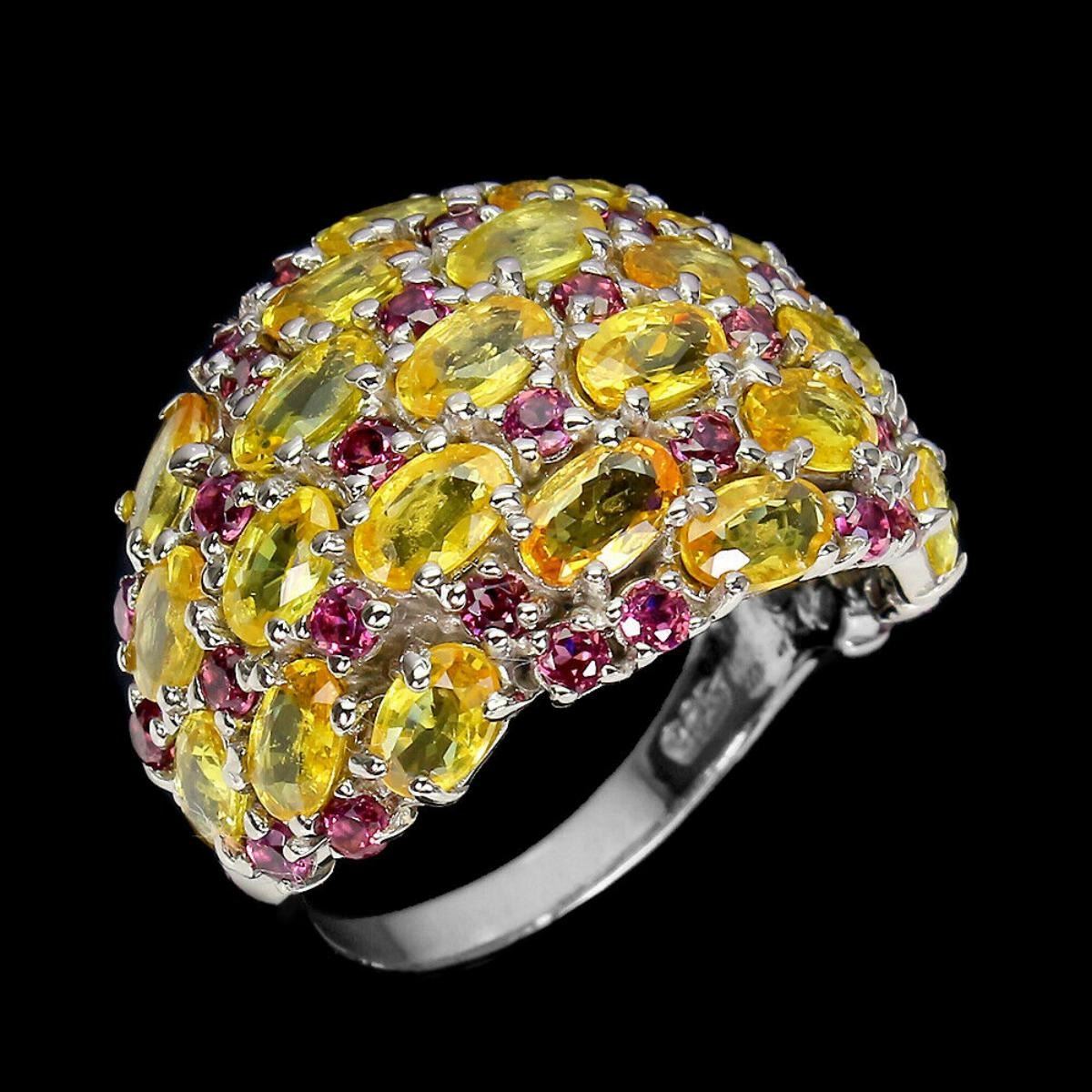 925 STERLING SILVER;PLATE-14K WHITE GOLD;RING SIZE(INCHES)-8.5(RESIZABLE);MAIN STONE-SAPPHIRE;OTHER GEMS-RHODOLITE GARNET;TOTAL WEIGHT-8.22 GRAM (TOTAL WEIGHT OF SILVER + STONE);DIMENSION-* STONE 2.0 TO 5.0 X 3.0 MM. * RING SIZE 8.5 * FACE RING 24.0 X 18.0 MM.;MAIN STONE SHAPE-OVAL;MAIN STONE COLOR-YELLOW;CLARITY/GRADE-IF TO VVS;ORIGIN-SONGEA - AFRICA;HARDNESS-9;