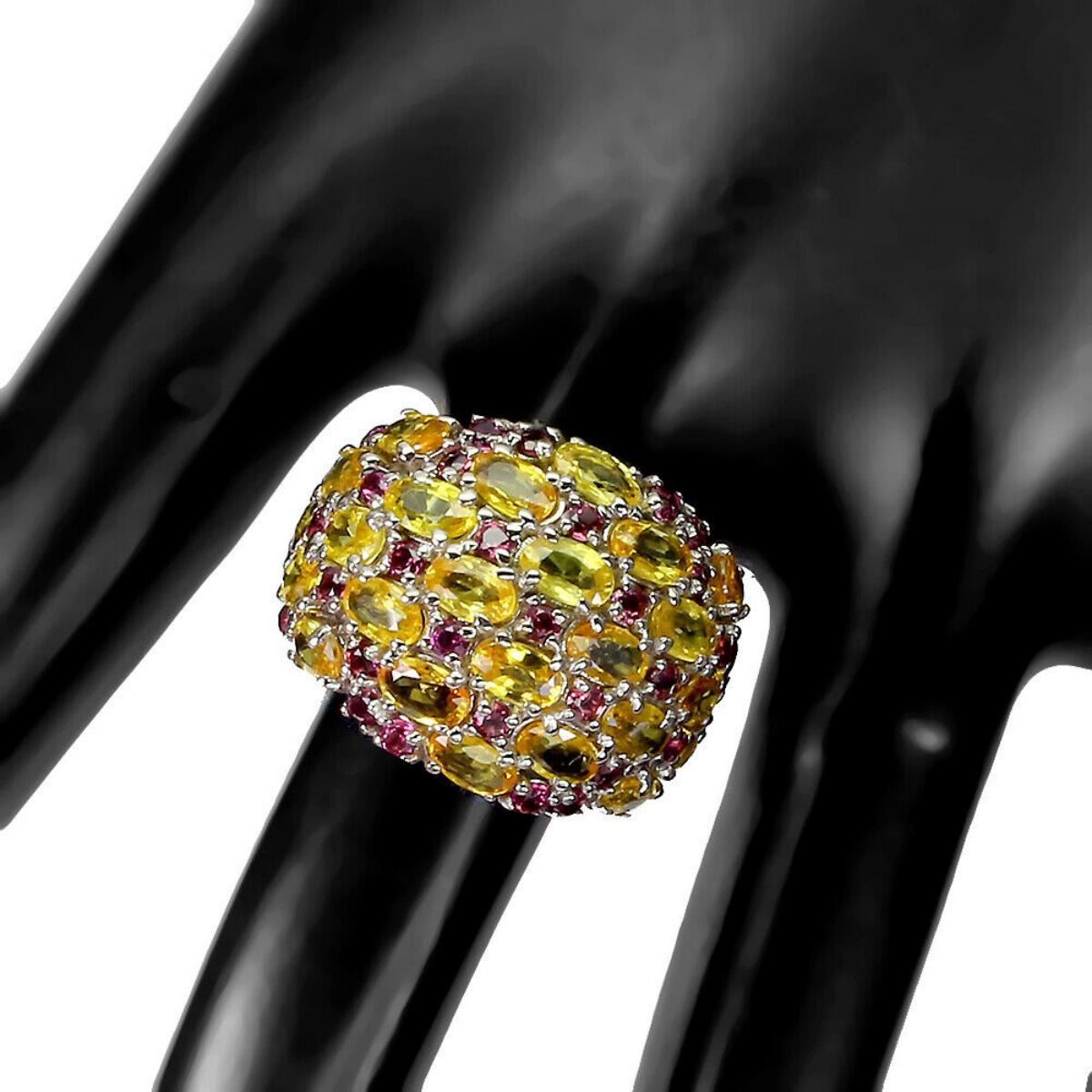 925 STERLING SILVER;PLATE-14K WHITE GOLD;RING SIZE(INCHES)-8.5(RESIZABLE);MAIN STONE-SAPPHIRE;OTHER GEMS-RHODOLITE GARNET;TOTAL WEIGHT-8.22 GRAM (TOTAL WEIGHT OF SILVER + STONE);DIMENSION-* STONE 2.0 TO 5.0 X 3.0 MM. * RING SIZE 8.5 * FACE RING 24.0 X 18.0 MM.;MAIN STONE SHAPE-OVAL;MAIN STONE COLOR-YELLOW;CLARITY/GRADE-IF TO VVS;ORIGIN-SONGEA - AFRICA;HARDNESS-9;