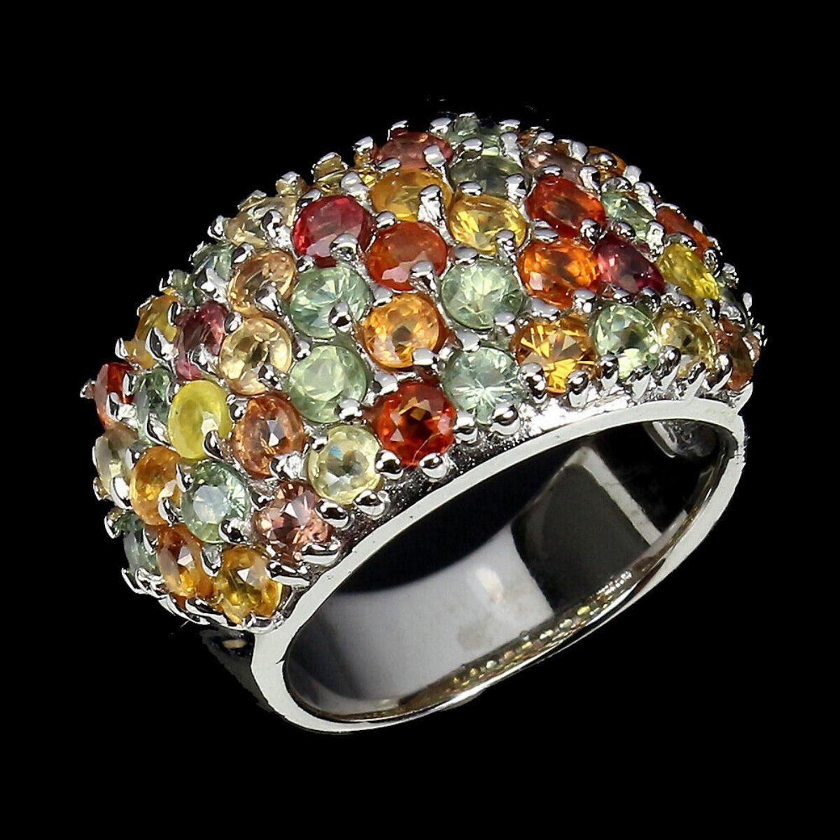 925 STERLING SILVER;PLATE-14K WHITE GOLD;RING SIZE-6.5(RESIZABLE);MAIN STONE-SAPPHIRE;TOTAL WEIGHT-8.79 GRAM (TOTAL WEIGHT OF SILVER + STONE);DIMENSION-* STONE 1.5 TO 5.0 X 4.0 MM * RING SIZE 9.0* FACE RING 24.0 X 18.0 MM.;MAIN STONE SHAPE-ROUND CUT;MAIN STONE COLOR-MULTI-COLOR;CLARITY/GRADE-IF TO VVS;TREATMENT-HEATED;ORIGIN-SONGEA - AFRICA;HARDNESS-9.0;