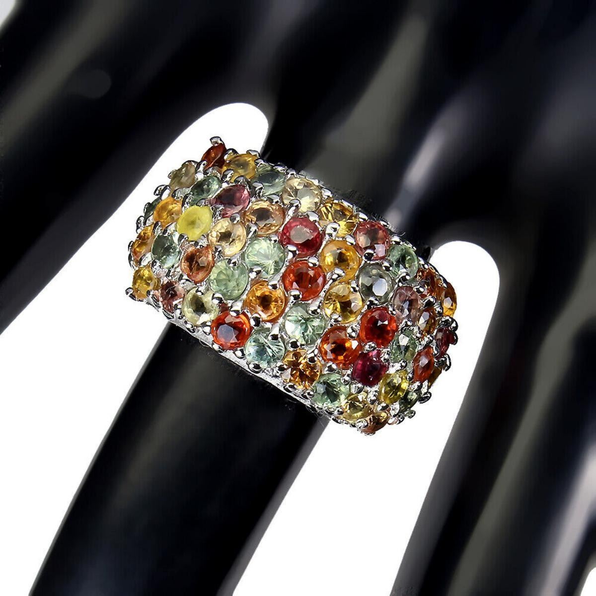 925 STERLING SILVER;PLATE-14K WHITE GOLD;RING SIZE-6.5(RESIZABLE);MAIN STONE-SAPPHIRE;TOTAL WEIGHT-8.79 GRAM (TOTAL WEIGHT OF SILVER + STONE);DIMENSION-* STONE 1.5 TO 5.0 X 4.0 MM * RING SIZE 9.0* FACE RING 24.0 X 18.0 MM.;MAIN STONE SHAPE-ROUND CUT;MAIN STONE COLOR-MULTI-COLOR;CLARITY/GRADE-IF TO VVS;TREATMENT-HEATED;ORIGIN-SONGEA - AFRICA;HARDNESS-9.0;