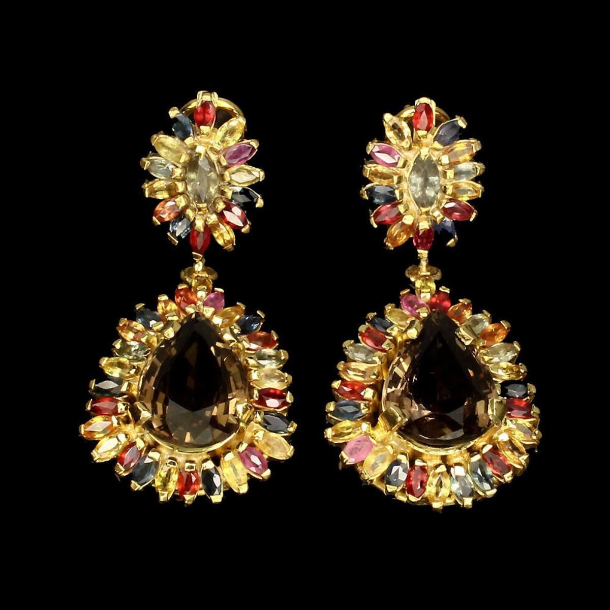 925 STERLING SILVER;PLATE14K YELLOW GOLD;MAIN STONE-SMOKY QUARTZ;OTHER GEMS-SAPPHIRE;TOTAL WEIGHT-100.27 CT (TOTAL WEIGHT OF SILVER + STONE)DIMENSION* STONE 4.0 X 2.0 TO 15.0 X 11.0 MM. * FACE EARRINGS 49.0 X 21.0 MM.-MAIN STONE SHAPE-PEAR CUT;MAIN STONE COLOR-TOP SMOKY;CLARITY/GRADE-IF;LUSTERGORGEOUS;TREATMENT-UNHEATED;ORIGIN-BRAZIL;HARDNESS-7.0 - 9.0;