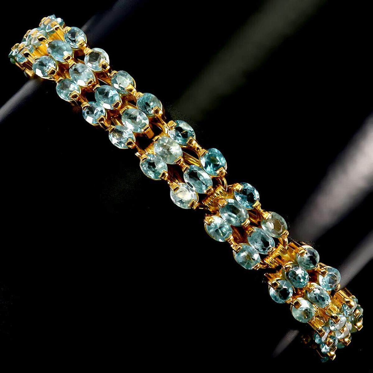 925 STERLING SILVER;PLATE-14K YELLOW GOLD;LENGTH (INCHES)-7.5;MAIN STONE- ZIRCON;TOTAL WEIGHT-25.67 GRAM (TOTAL WEIGHT OF SILVER + STONE);DIMENSION-* STONE 4.0 X 3.0 MM. * TOTAL LENGTH 7.5 INCHES. * FACE BRACELET 175.0 X 9.0 MM.;MAIN STONE SHAPE-ROUND;MAIN STONE COLOR-SEAFOAM BLUE;CLARITY/GRADE-IF ;ORIGIN-CAMBODIA;HARDNESS-7;